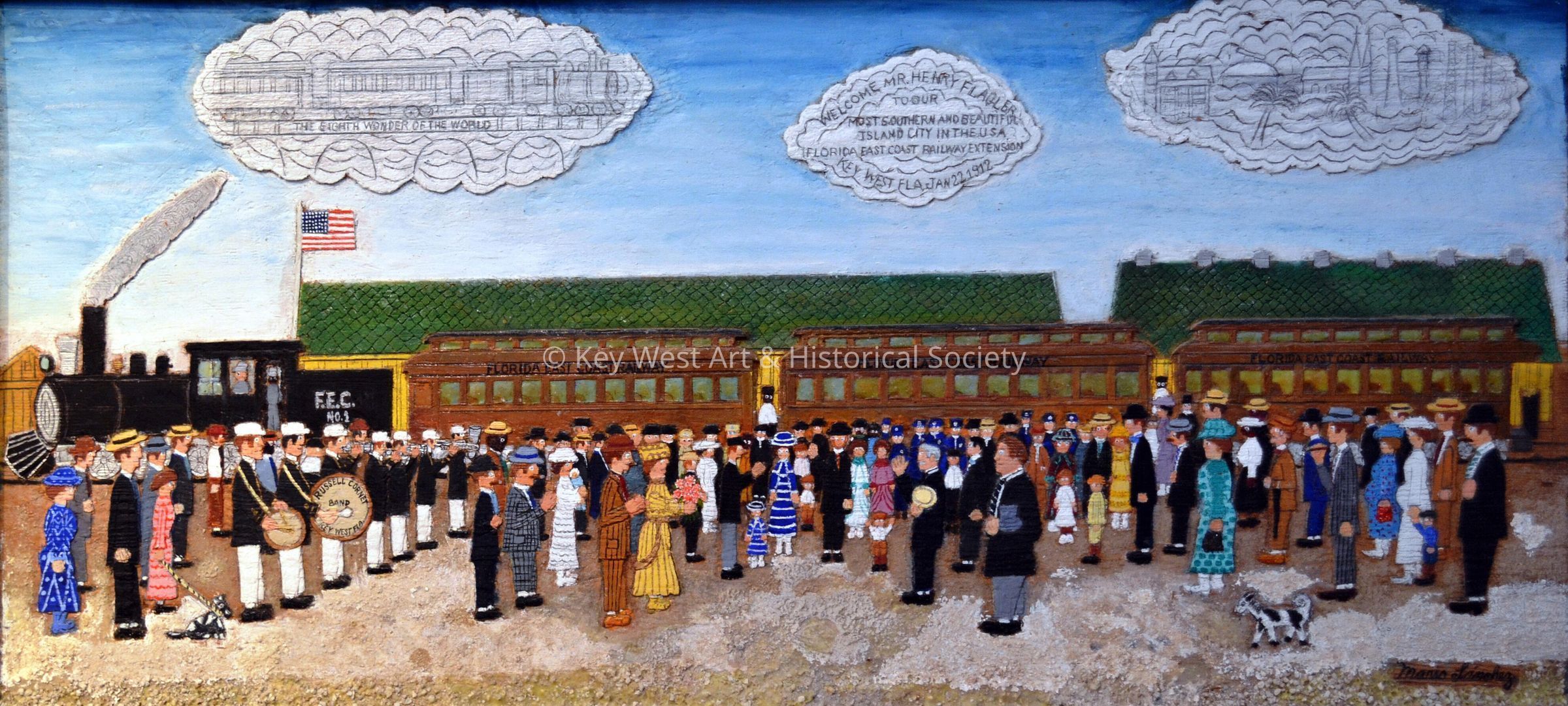 Wood carving by Mario Sanchez depicting the arrival of the first Florida East Coast Railway train to Key West in 1912. Key West residents and a band greet Henry Flagler and the Overseas Railway train passengers as they get off the train. Carved in the center cloud, 'Welcome Mr. Henry Flagler to our most southern and beautiful island city in the USA. Florida East Coast Railway Extension Key West Fla Jan 22, 1912'.Type of Sculpture