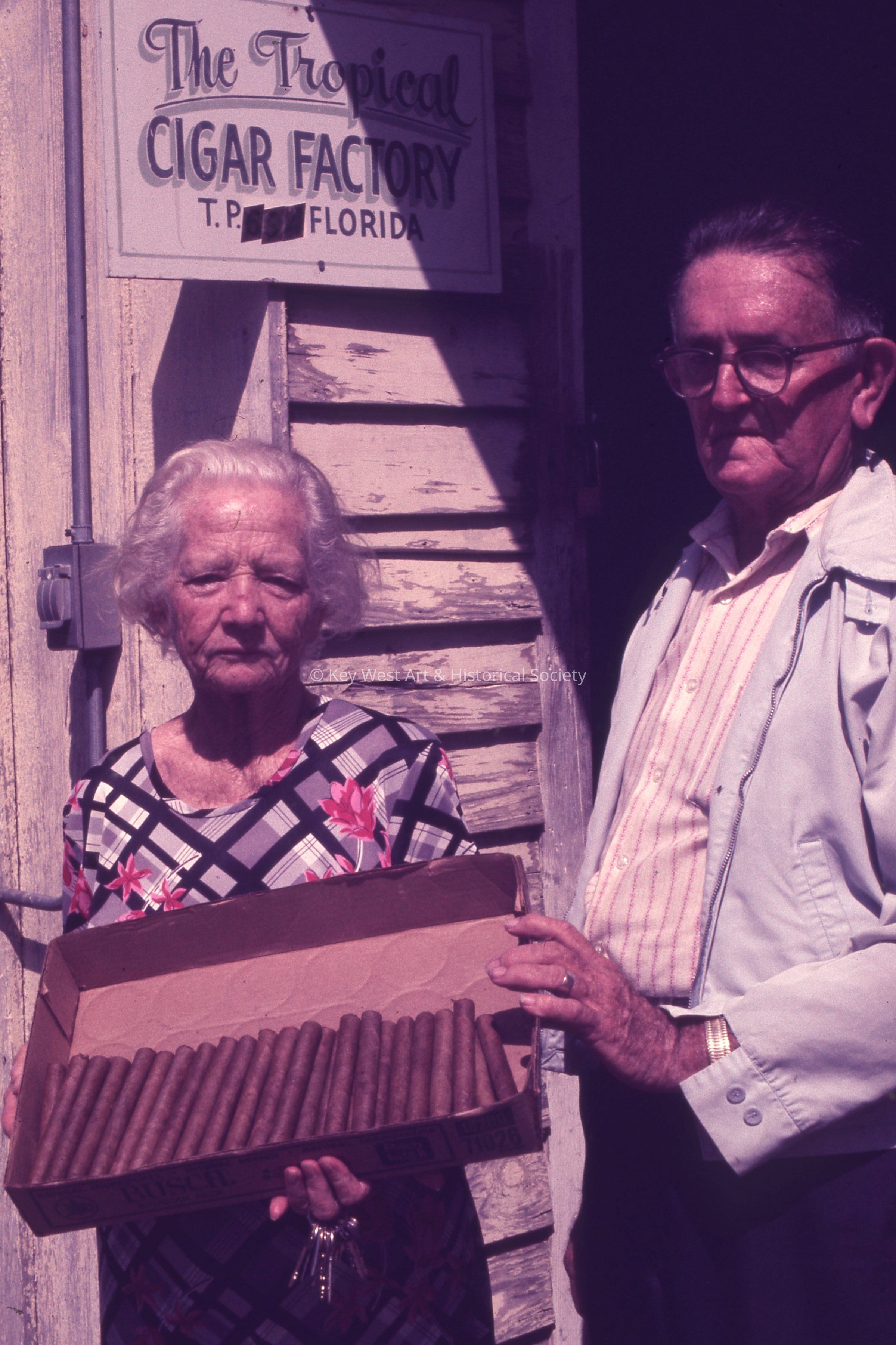 35mm color slide of Willard Bell and his wife Almead Bell standing in front of The Tropical Cigar Factory. Almead is holding a box of their hand rolled cigars. The factory was formerly located on the corner of Fleming and Margaret streets.