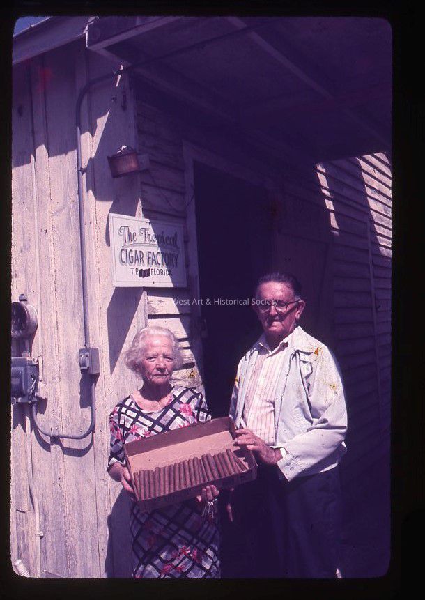 35mm color slide of Willard Bell and his wife Almead Bell standing in front of The Tropical Cigar Factory. Almead is holding a box of their hand rolled cigars. The factory was formerly located on the corner of Fleming and Margaret streets.
