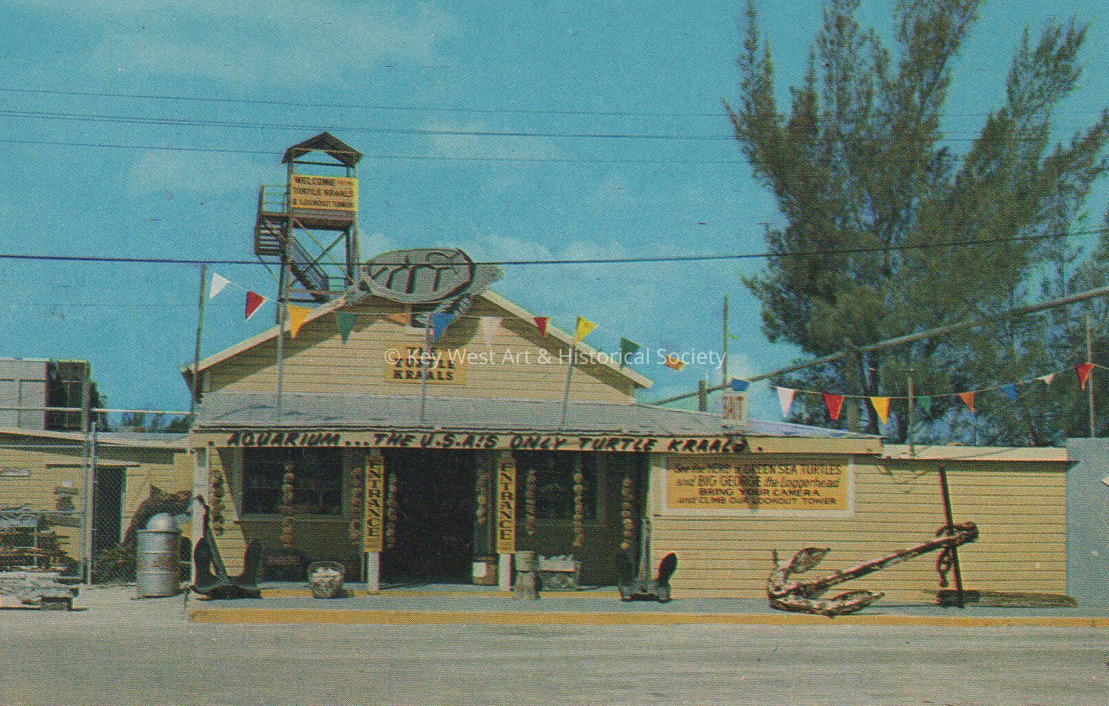 Postcard depicting an anchor and a building with a sign that reads, 'The Turtle Kraals'. The description on the verso reads, 'Entrance to the Turtle Kraals, a unique marine attraction in Key West featuring the giant sea turtles. It is the only one of its kind in the United States.'Subject Place