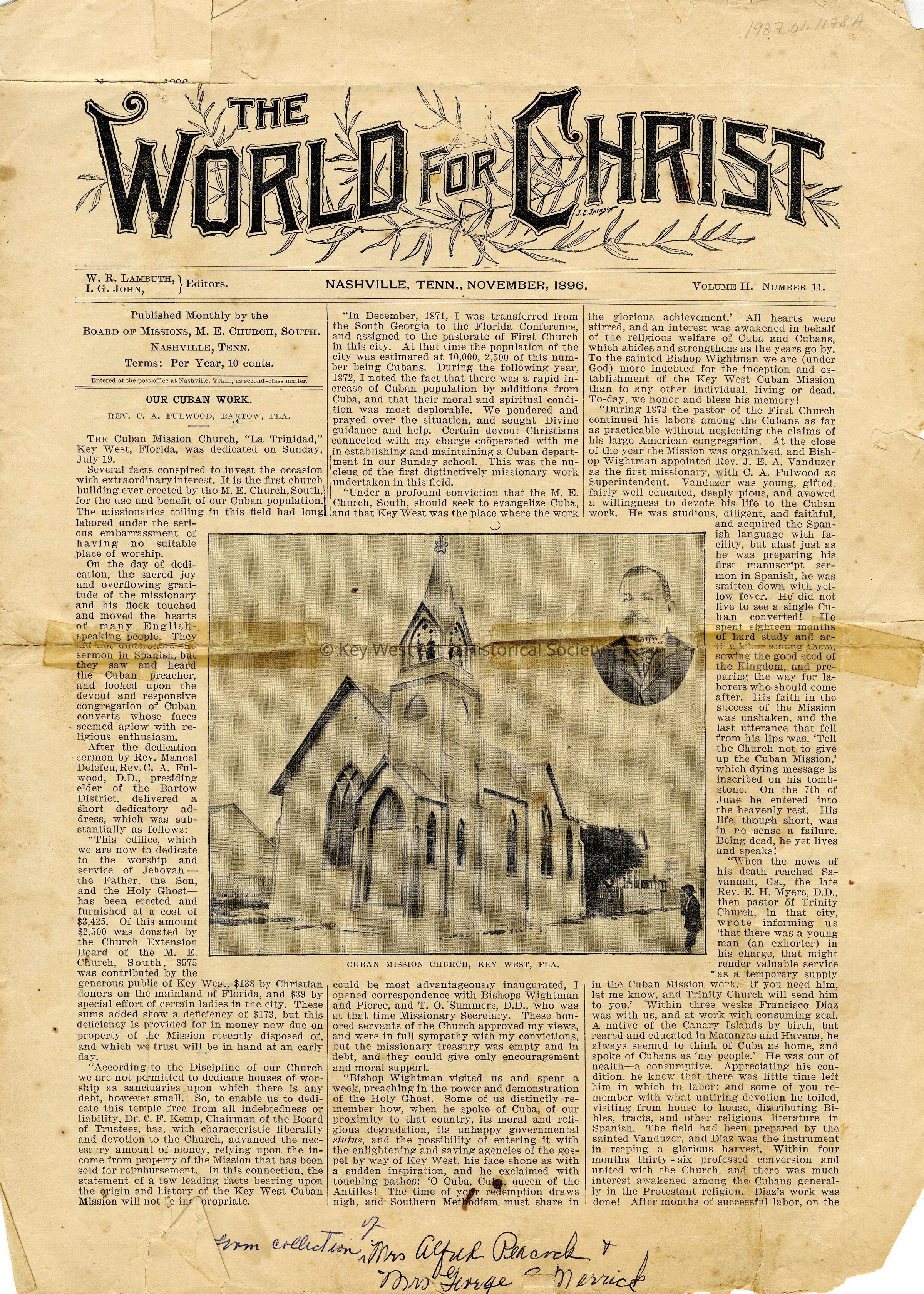 Printed newspaper entitled, 'The World for Christ' that features a front page article on the opening and dedication of the Cuban Mission Church in Key West.
