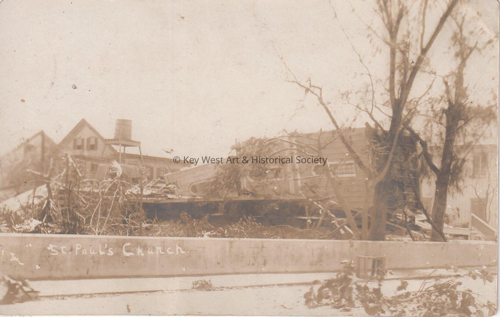 Photograph postcard depicting the damage to St. Paul's Church following the hurricane of 1909. The caption reads, ‘St. Paul's Church’.Collection