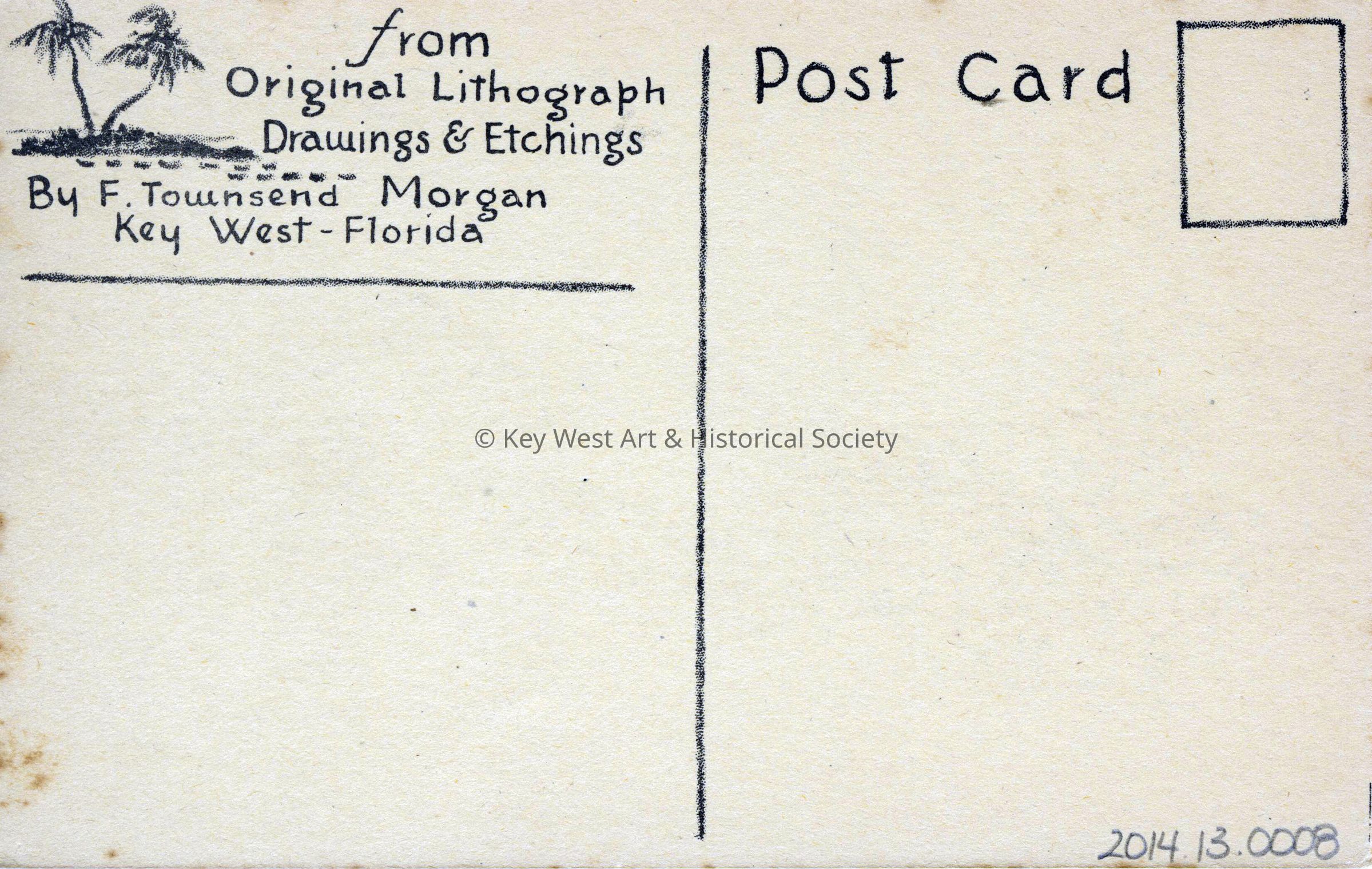 Postcard depicting Thompson's dock and turtle crawls [turtle kraals] in Key West taken from a lithograph by Franklin Townsend Morgan. The caption reads, 'Thompson's Docks and Turtle Crawls - Key West, Florida’.Subject Place
