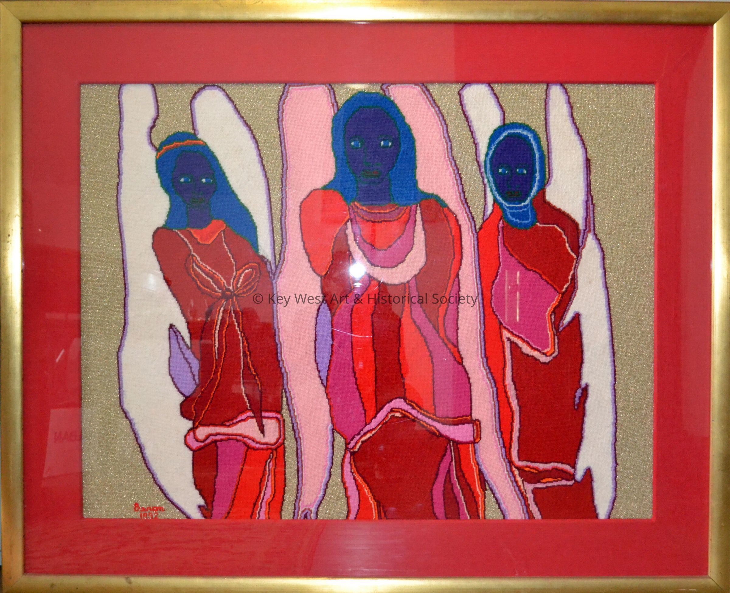 Needlepoint tapestry by Jack Baron depicting three angels dressed in red with white and pink wings.Collection