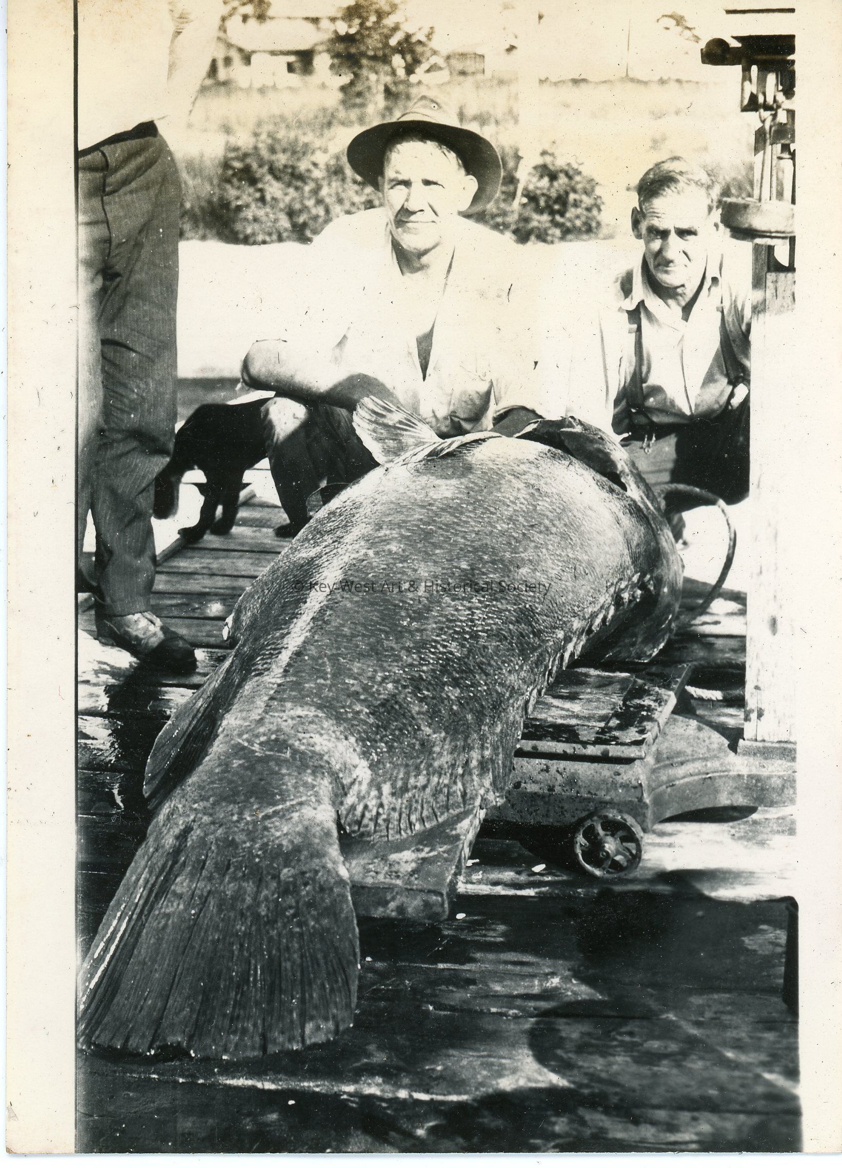 Black and white photograph of three men standing and crouching behind a goliath grouper. Behind the men is a small dog. The photo was part of a photograph album began by Victor H. Baker in 1940.