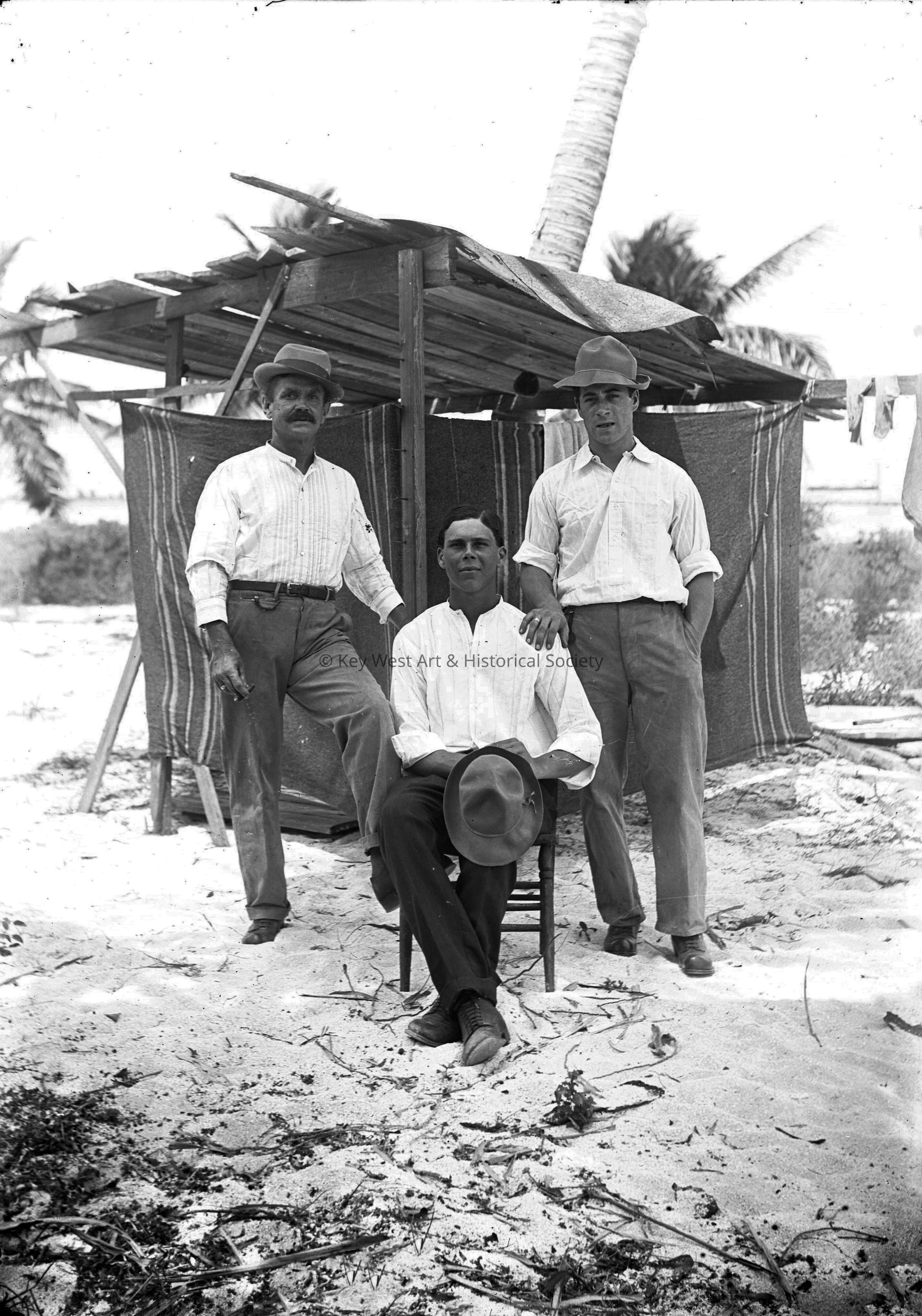 Black and white dry plate glass negative of three unknown men in front of the shower stall at the railroad camp on Pigeon Key. The image was taken during the construction of Seven Mile Bridge on the Overseas Railway.