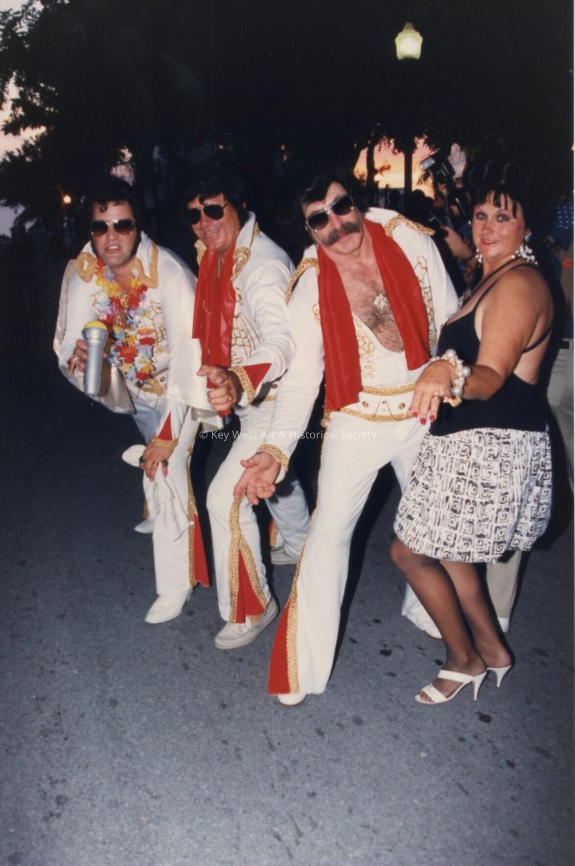 Three unknown men dressed as Elvis with an unknown woman.Entry/Object ID