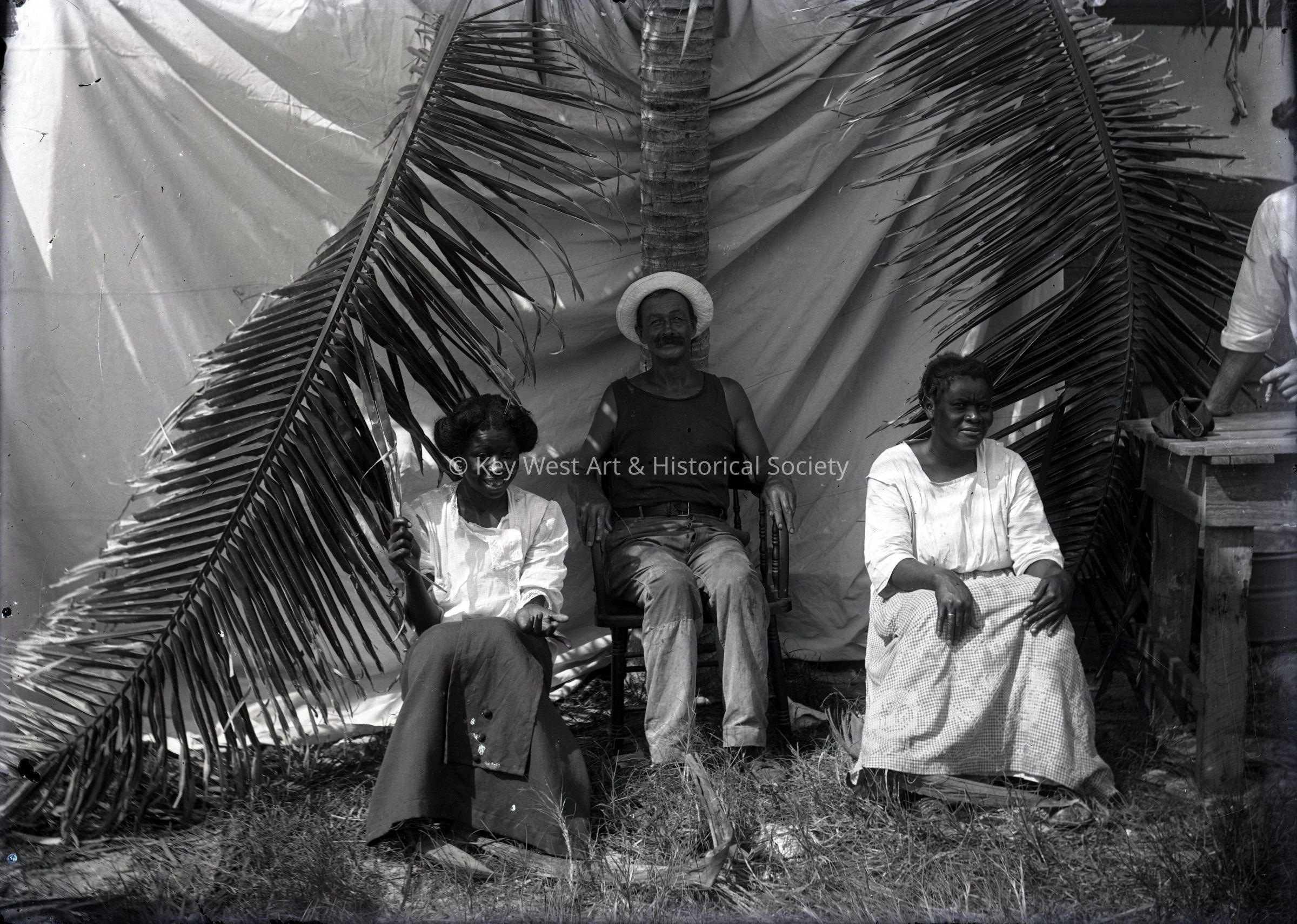 Black and white dry plate glass negative of three unknown workers (one man and two women) at the railroad camp on Pigeon Key. The image was taken during the construction of Seven Mile Bridge on the Overseas Railway.