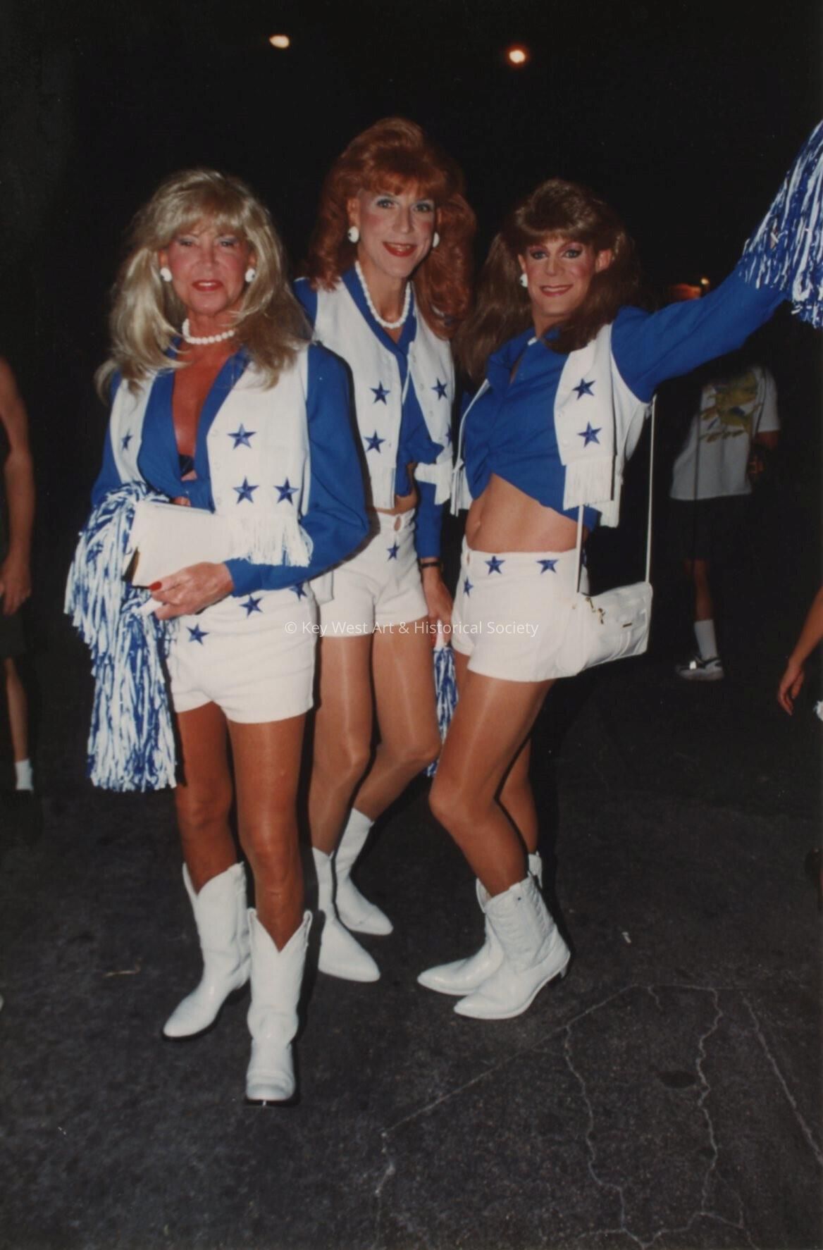 Three unknown people dressed up as cheerleaders.Entry/Object ID