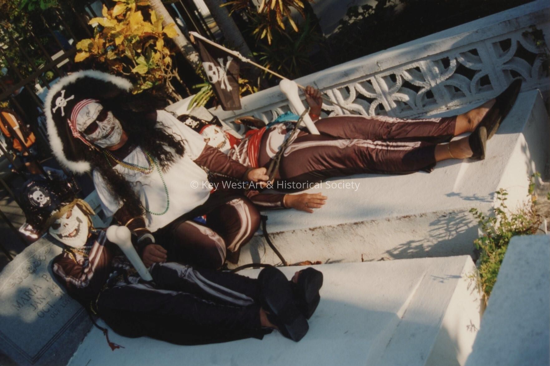 Three unknown people dressed up at the cemetery.Entry/Object ID