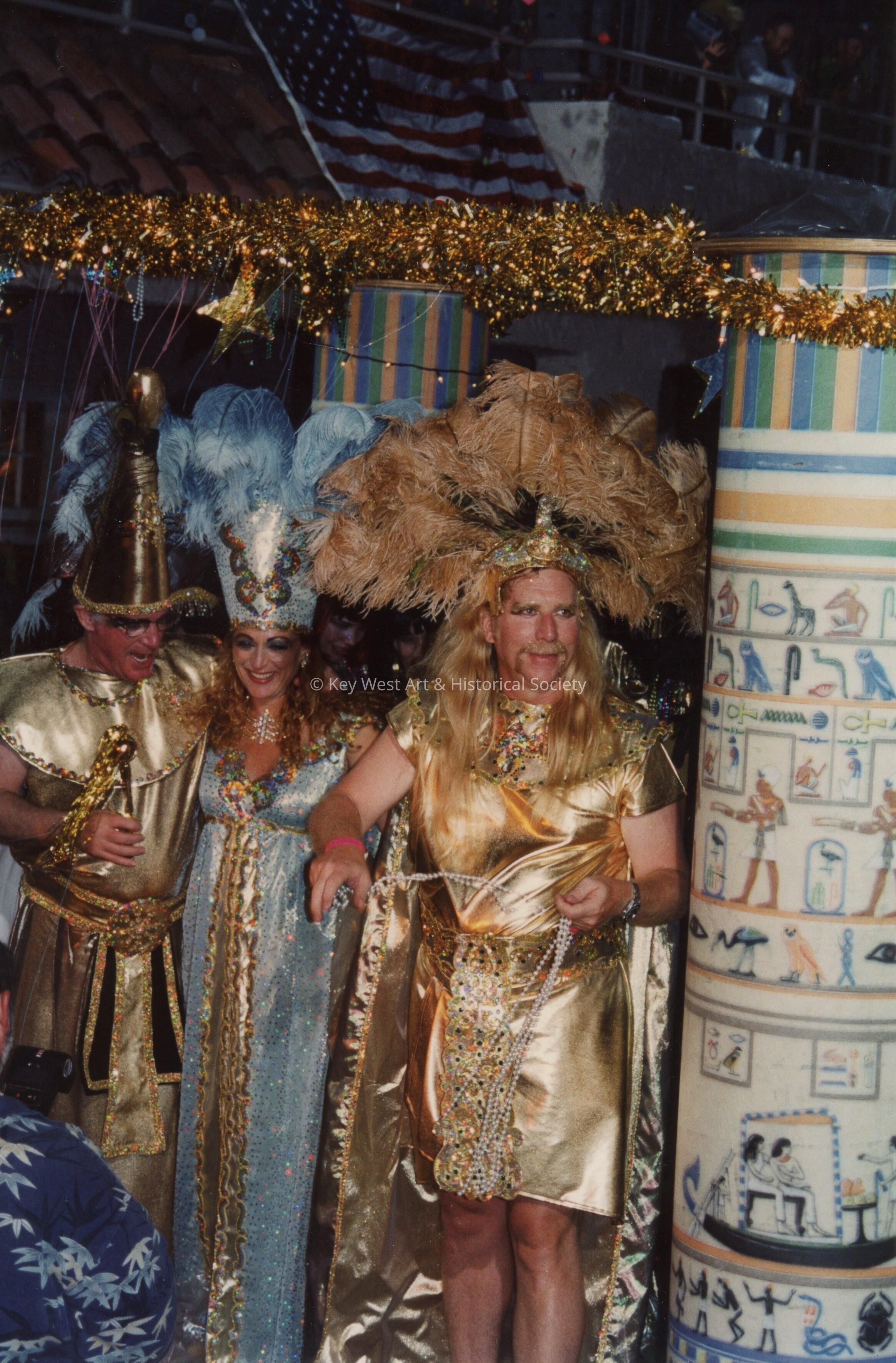 Three unknown people dressed up on a float for the parade.Entry/Object ID