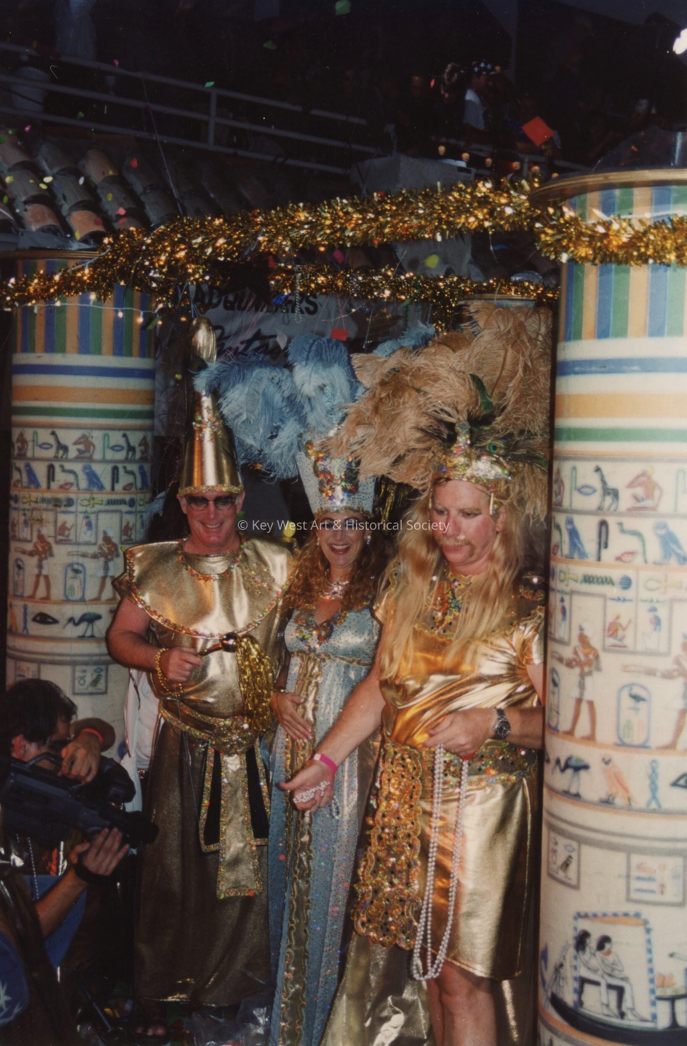 Three unknown people dressed up on a float for the parade.Entry/Object ID
