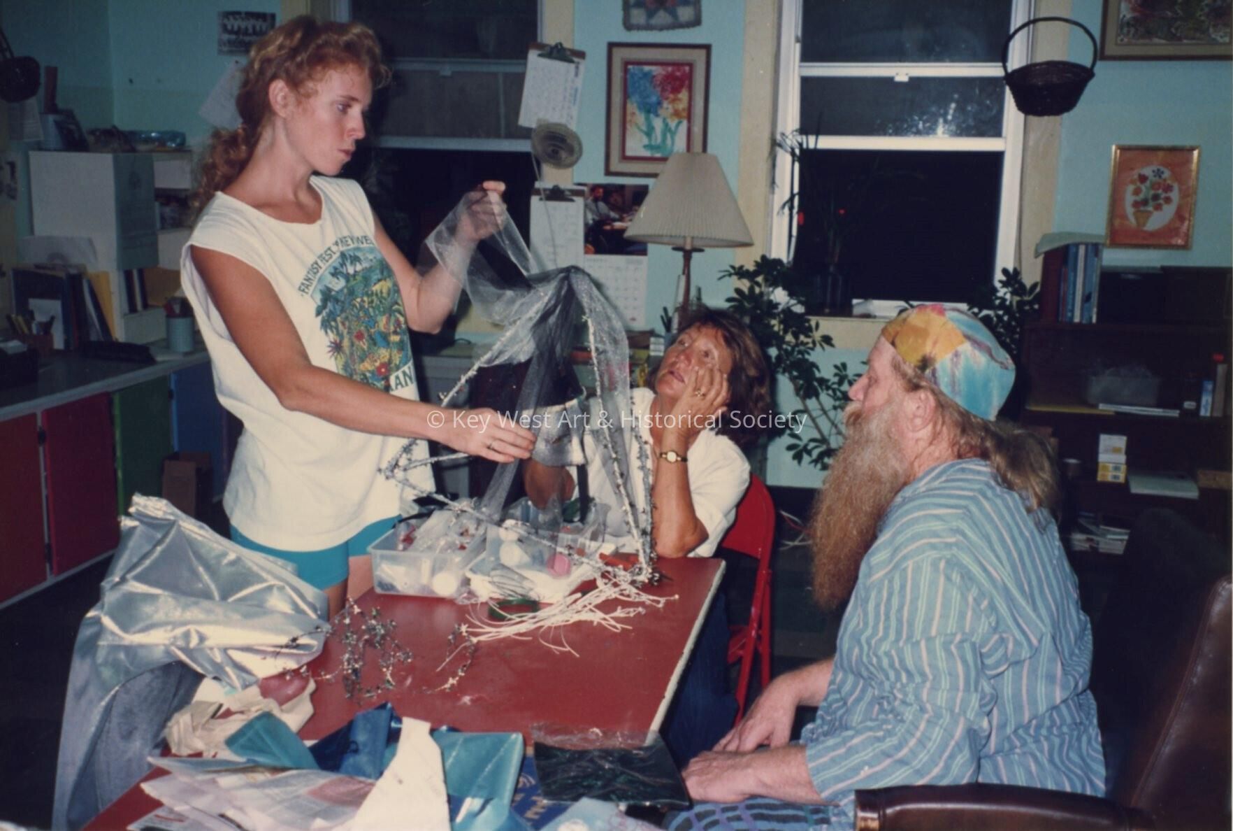 Three unknown people in a house making costumes.Entry/Object ID