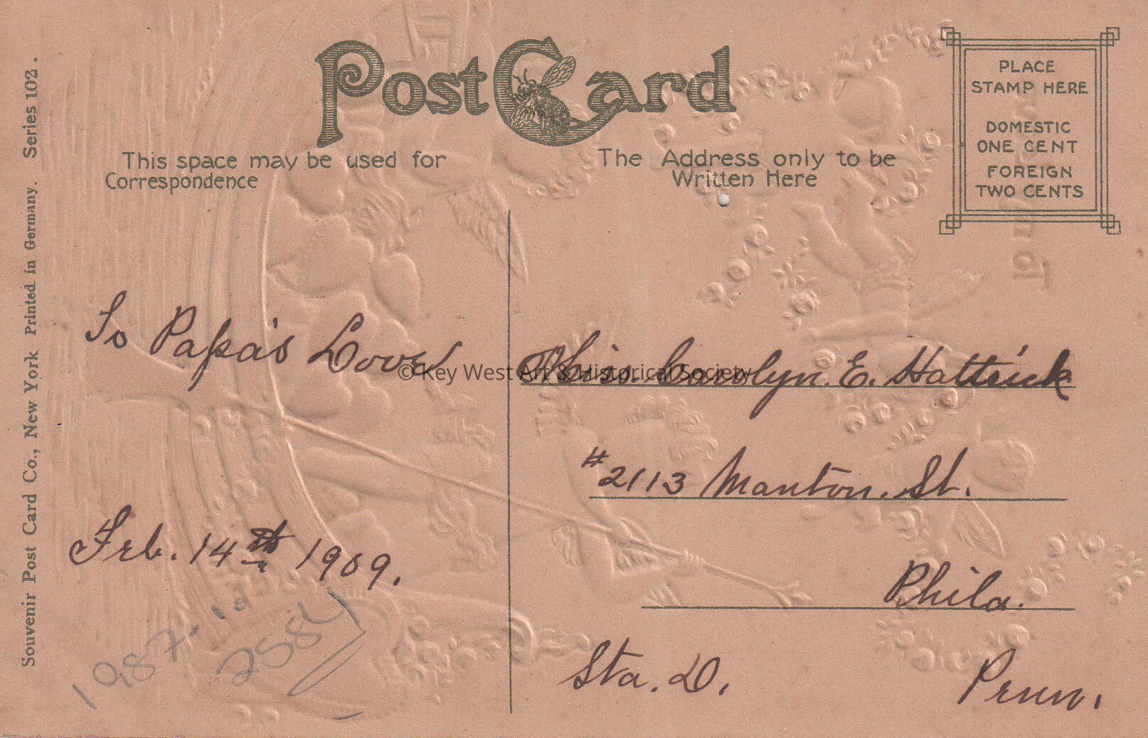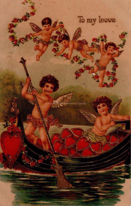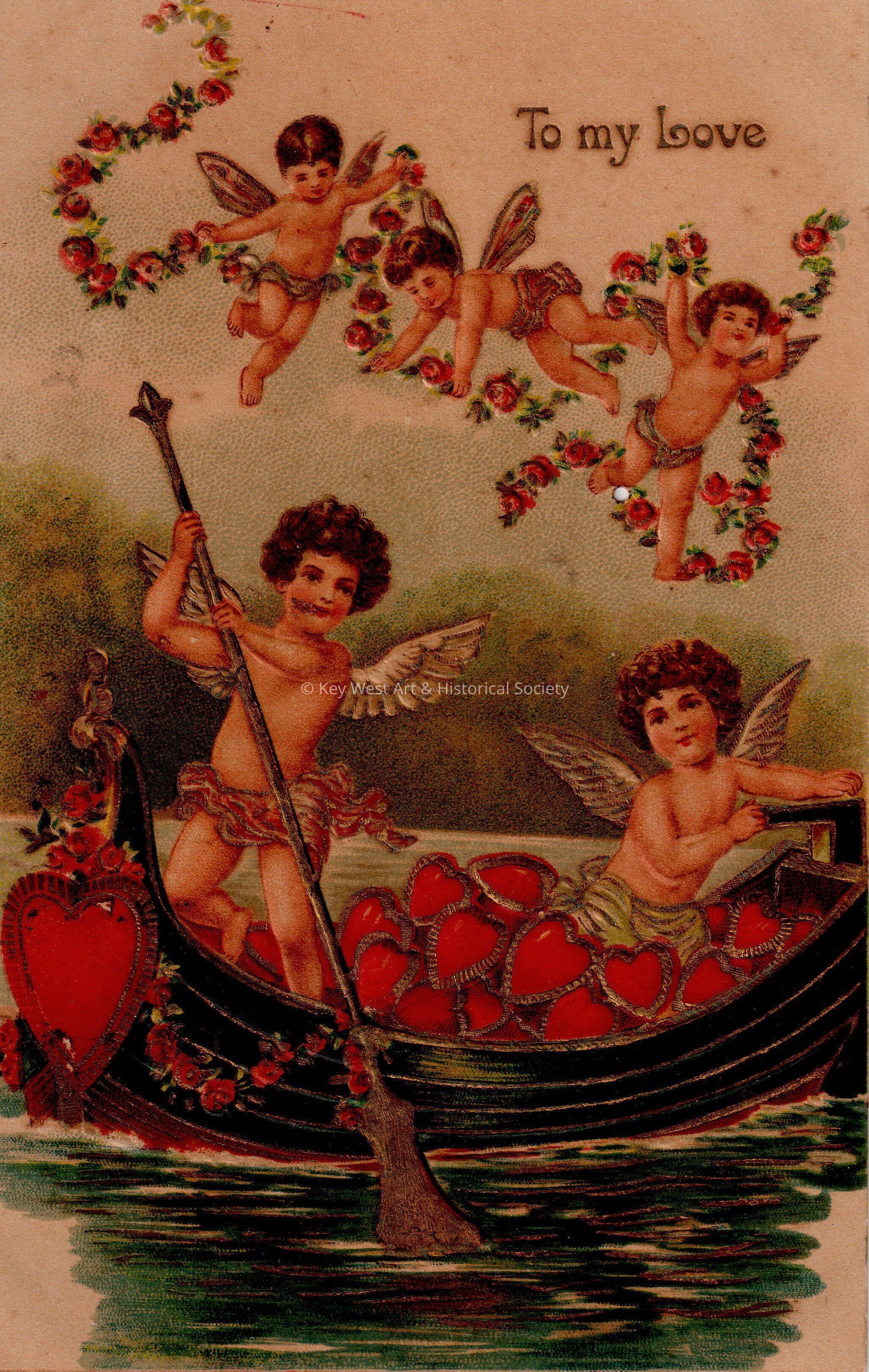 Postcard depicting cupids in a boat with hearts and in the air with a garland for Valentine's Day. The caption reads, ‘To My Love’. The message on the verso reads, ‘To Papa's love, February 14, 1909'. The card is addressed to Miss Carolyn E. Hattrick, 2113 Manton Street, Station D, Philadelphia, Pennsylvania.Collection