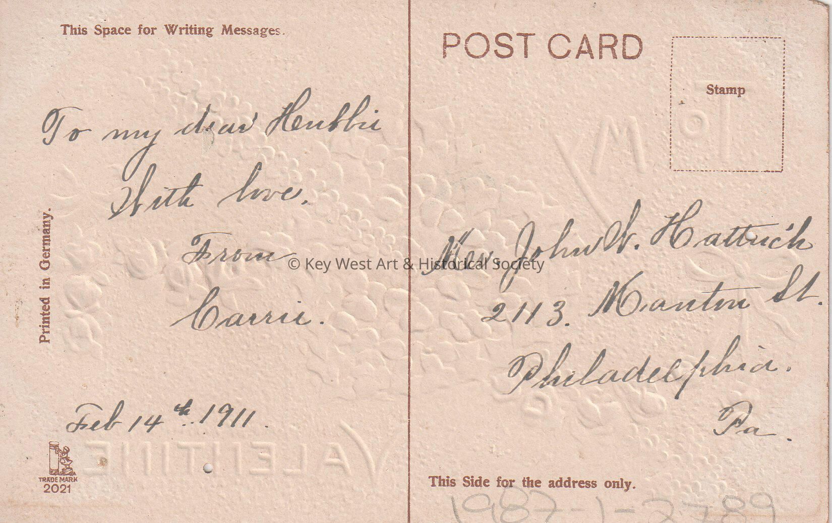 Postcard depicting a heart pierced with an arrow entirely made of flowers. The caption reads, ‘To My Valentine’.Collection