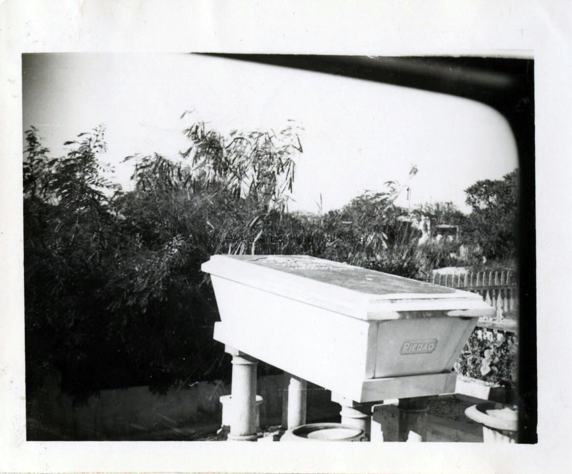 Black and white photograph an aboveground tomb at the Key West Cemetery. Handwritten on verso, 'Key West - Only kind of burial in the U.S. of this sort.'Collection