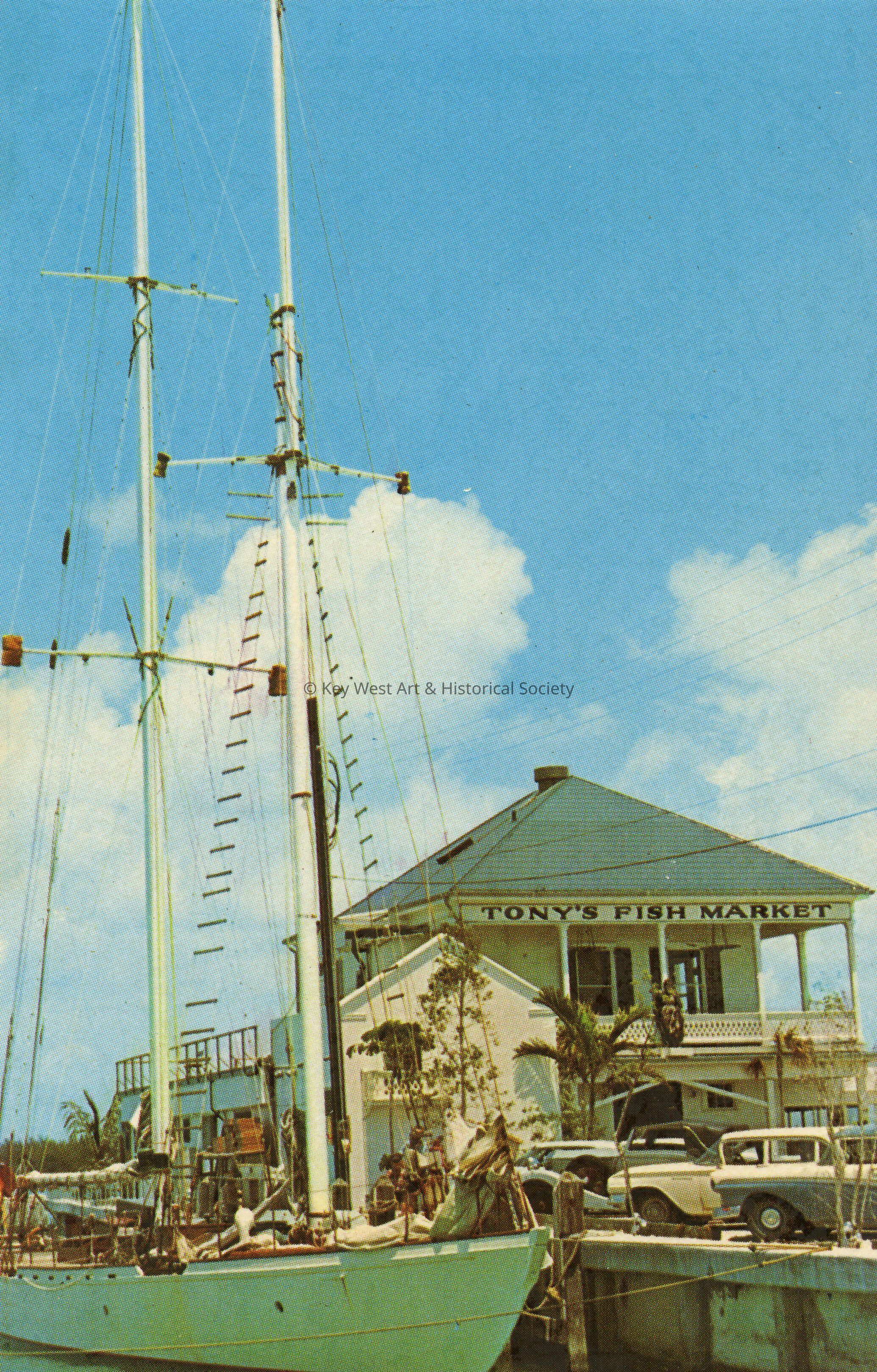 Postcard of Tony's Fish Market Restaurant at 0 Duval Street, part of the Pier House Resort. Notation on verso, 'Tony's Fish Market Restaurant Key West-Miami-Ft. Lauderdale. Located at the westernmost end of Duval Street, "the longest street in the world" stretching from the Gulf of Mexico to the Atlantic Ocean, Tony's Fish Market features fresh caught delicacies from the seas off Key West prepared in a gourmet manner. The unusual architecture was achieved by placing the old Porter Dock office above a modern restaurant in the old "widow's walk" manner. The Market is located on the Main Ship Channel where Navy destroyers and shrimp boats ply up and down before the diners.'Subject Place