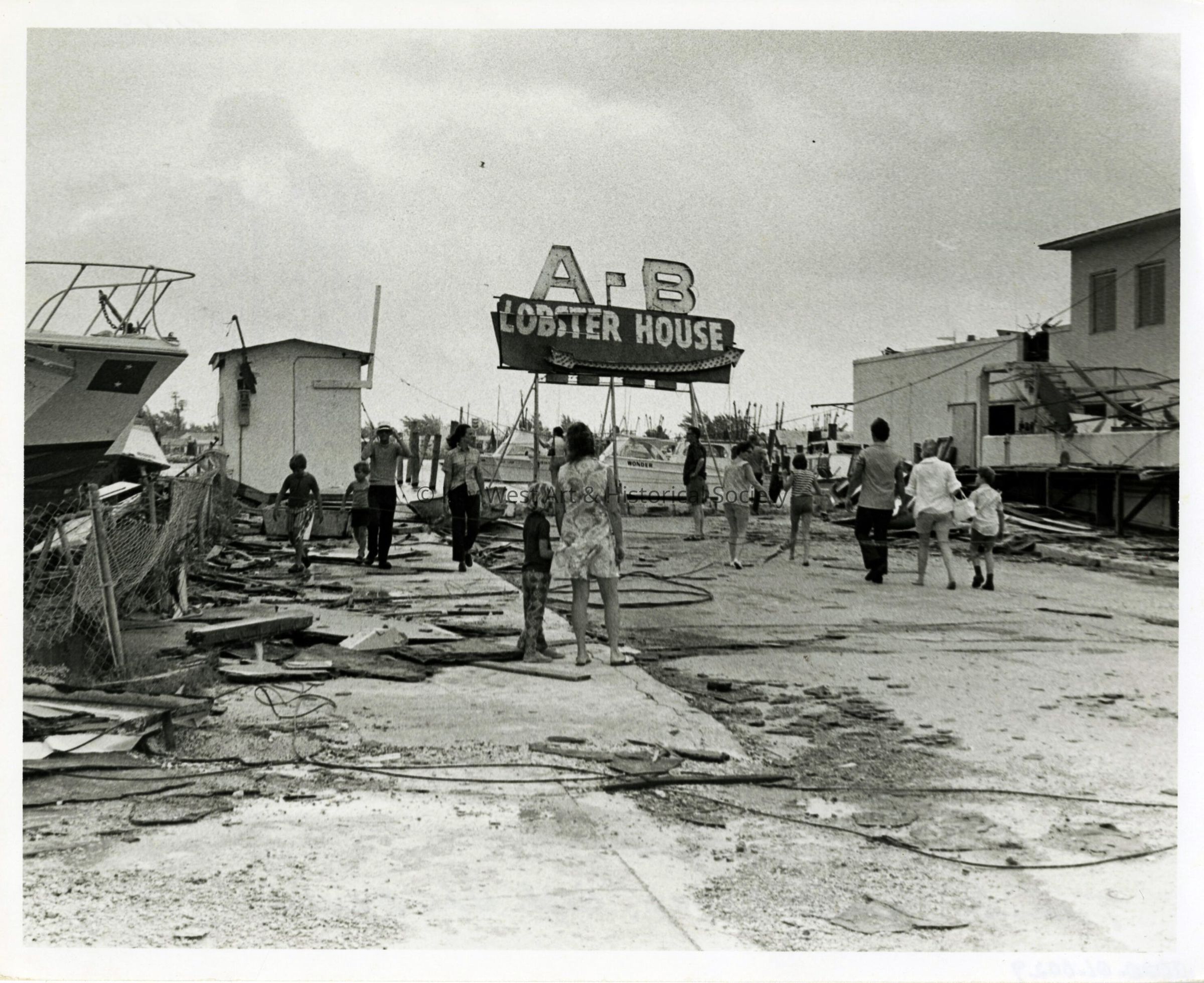 Black and white photograph showing damage at the end of Front Street and the A&B Lobster House sign from a tornado during Hurricane Agnes.