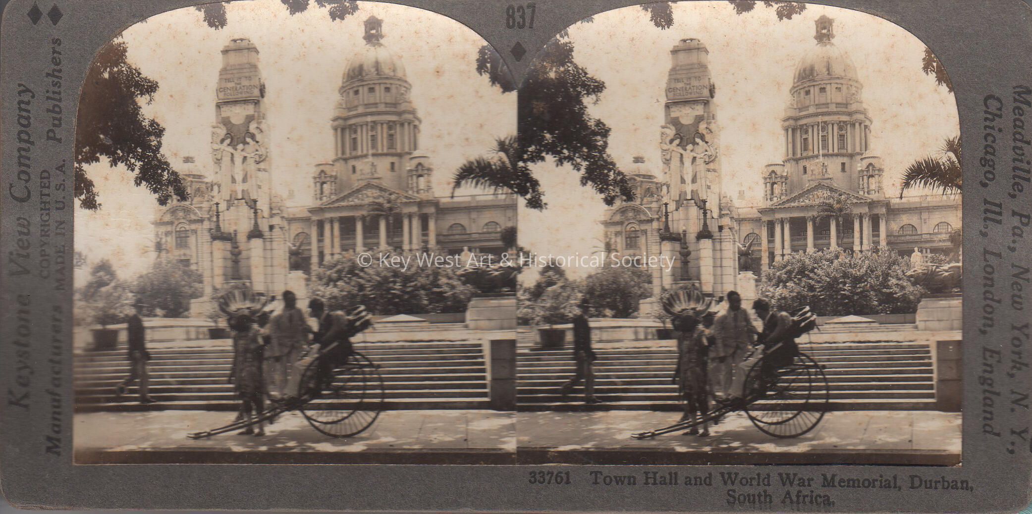 Stereoview of Town Hall and the World War I Memorial in Durban, South Africa.