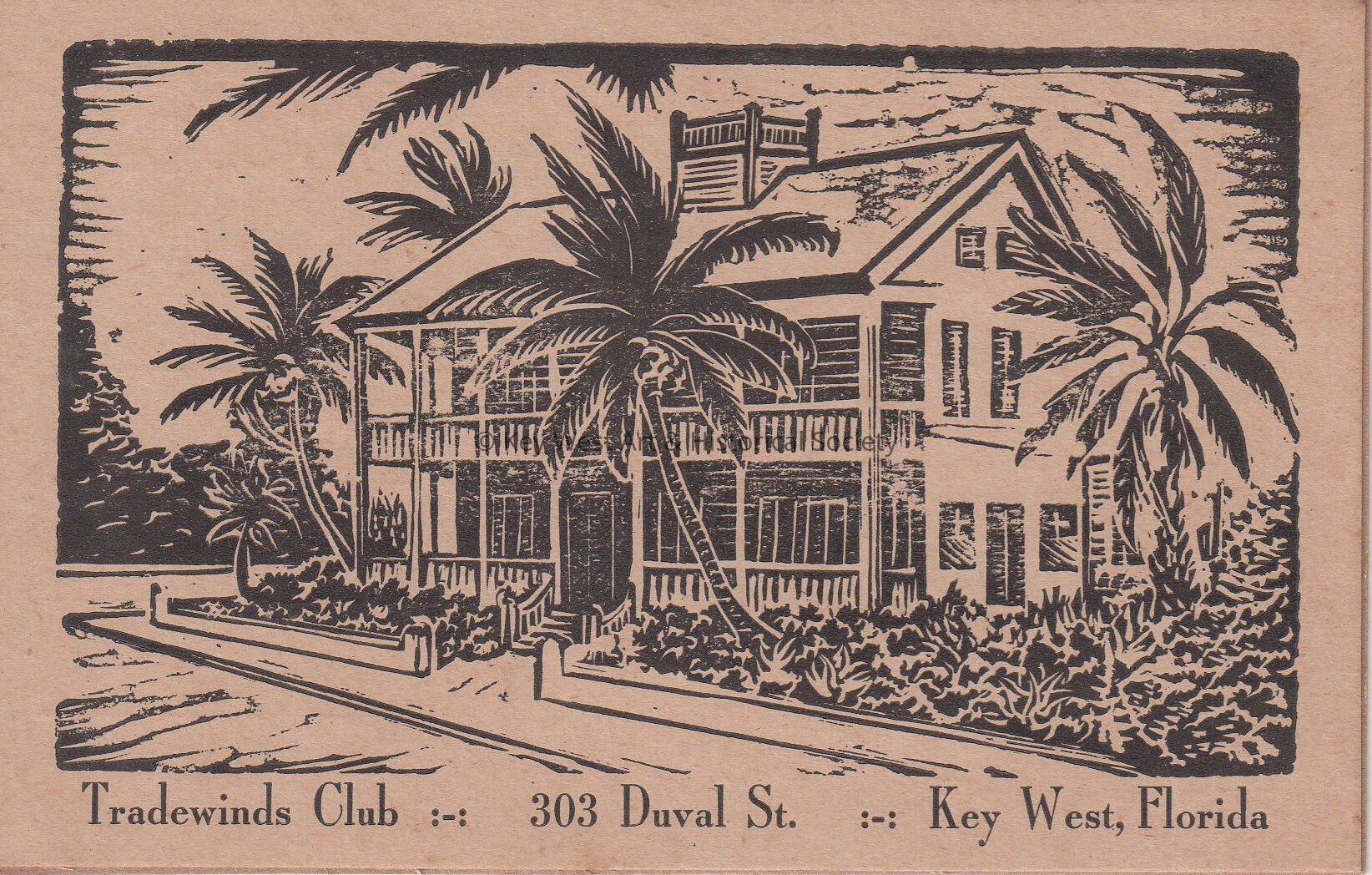 Postcard depicting palm trees near a building. The caption reads, ‘Tradewinds Club, 303 Duval Street, Key West, Florida.’ The description on the verso reads, ‘The Old Caroline Lowe House at 303 Duval Street is now The Tradewinds Club, a modern Cocktail Lounge & Restaurant. It is one of the few homes in Key West with a widow’s walk, from which Caroline Lowe flew the confederate flag in defiance of the Union Soldiers.’Subject Place