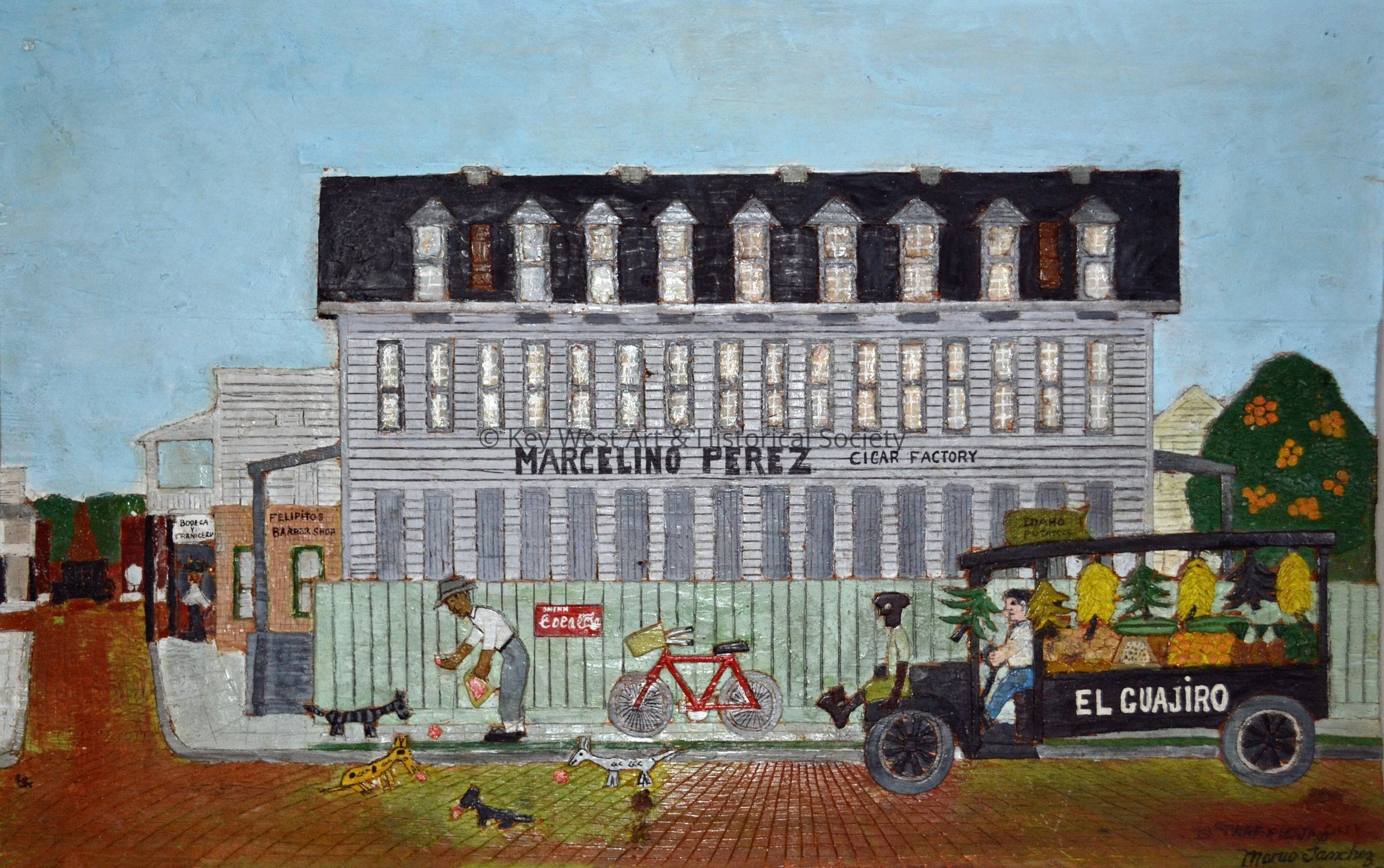 Wood carving by Mario Sanchez depicting the Marcelino Perez Cigar Factory. On the street is a man feeding stray dogs, causing a traffic delay for the El Gaujiro fruit delivery truck.Type of Sculpture
