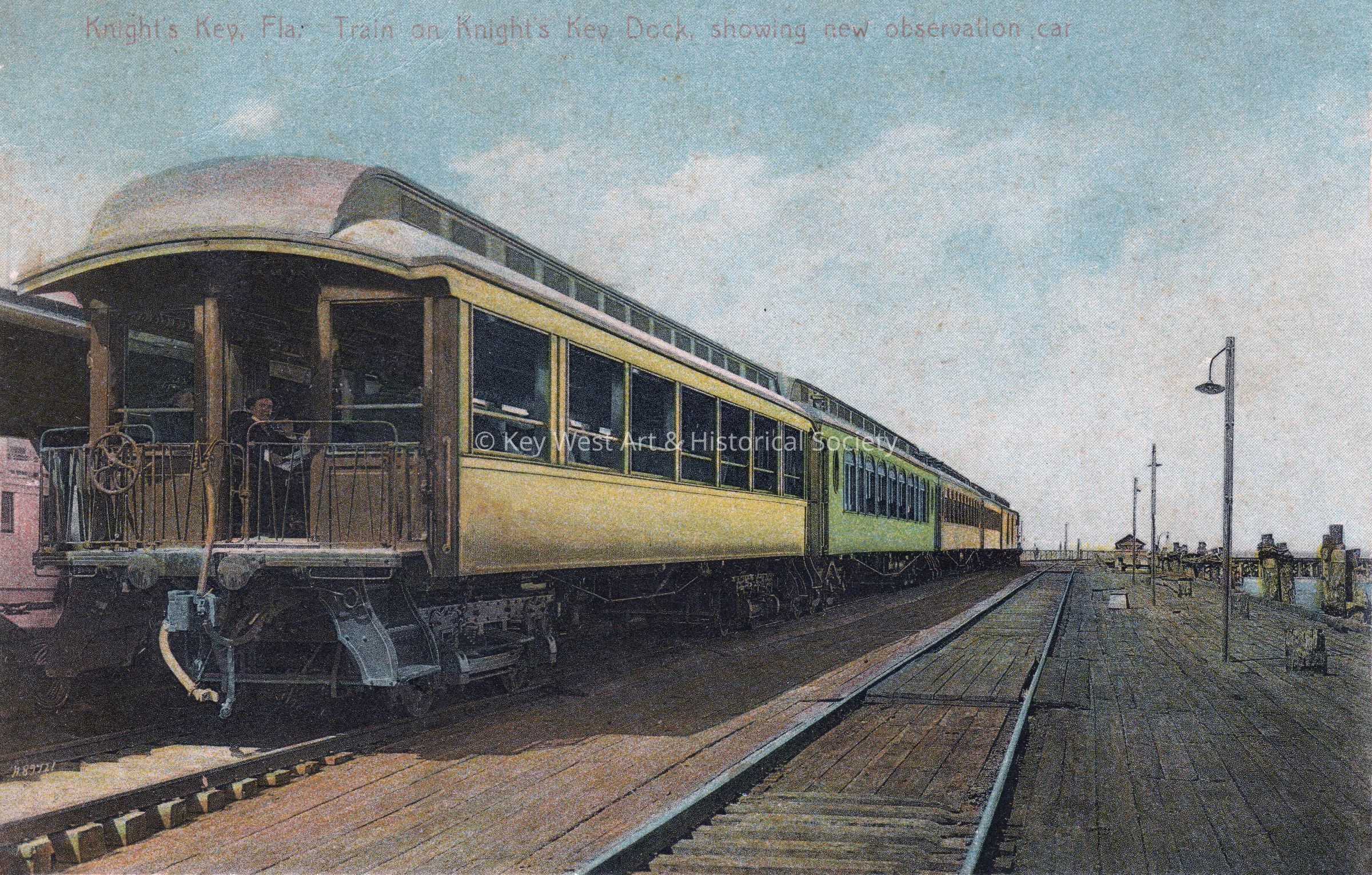Postcard depicting a train at Knight's Key Station. The caption reads, ‘Knights’ Key, Florida. Train on Knights’ Key dock showing new observation car.’Collection