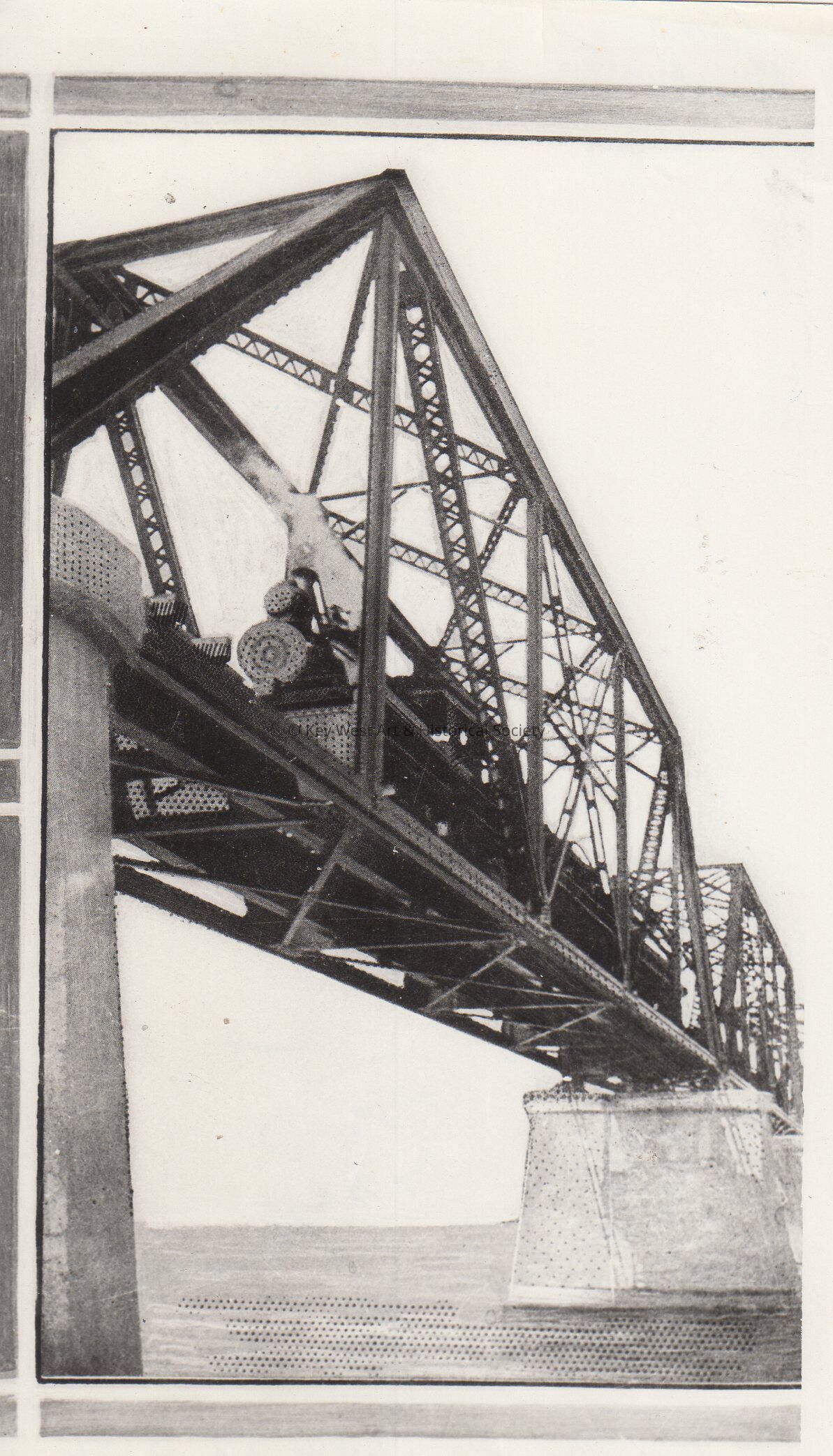 Black and white photograph of a Oversea Railway train crossing the Bahia Honda bridge.