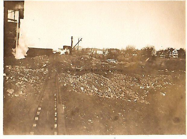 Black and white photograph of train tracks with houses in the background.