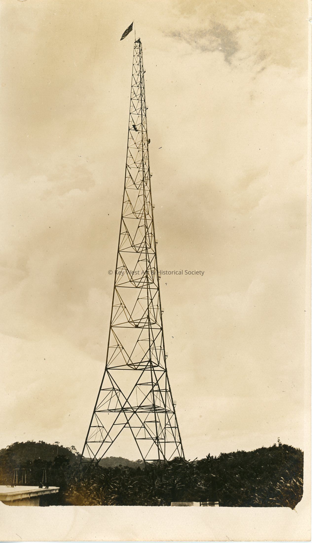 Black and white photograph depicting a large metal tower, likely a wireless telegraph station. The tower has an American flag at the top. The photograph was designed to be attached to a postcard backing.