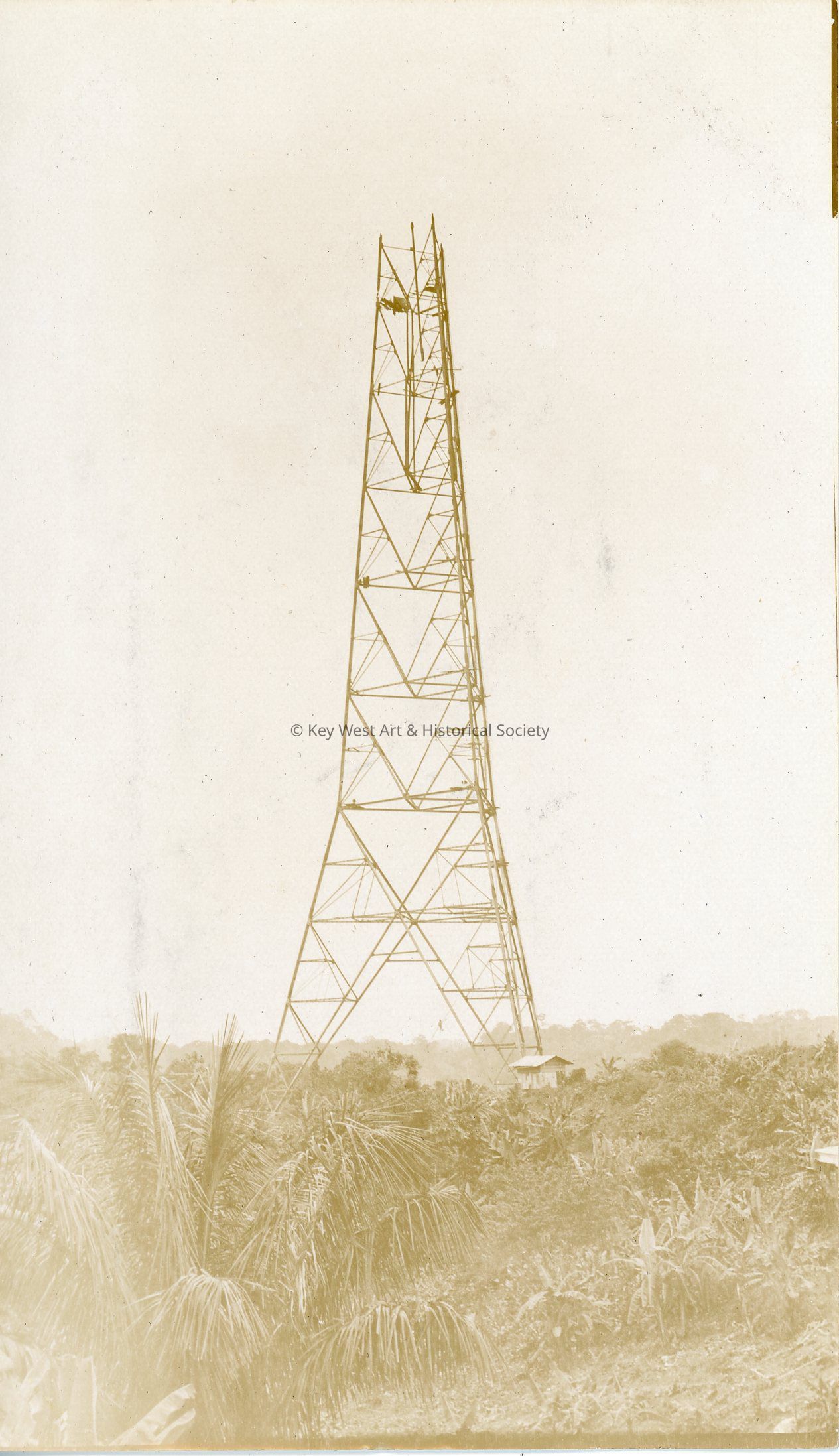 Black and white photograph depicting a large metal tower under construction. It is likely intended to be a wireless telegraph station. The photograph was designed to be attached to a postcard backing.