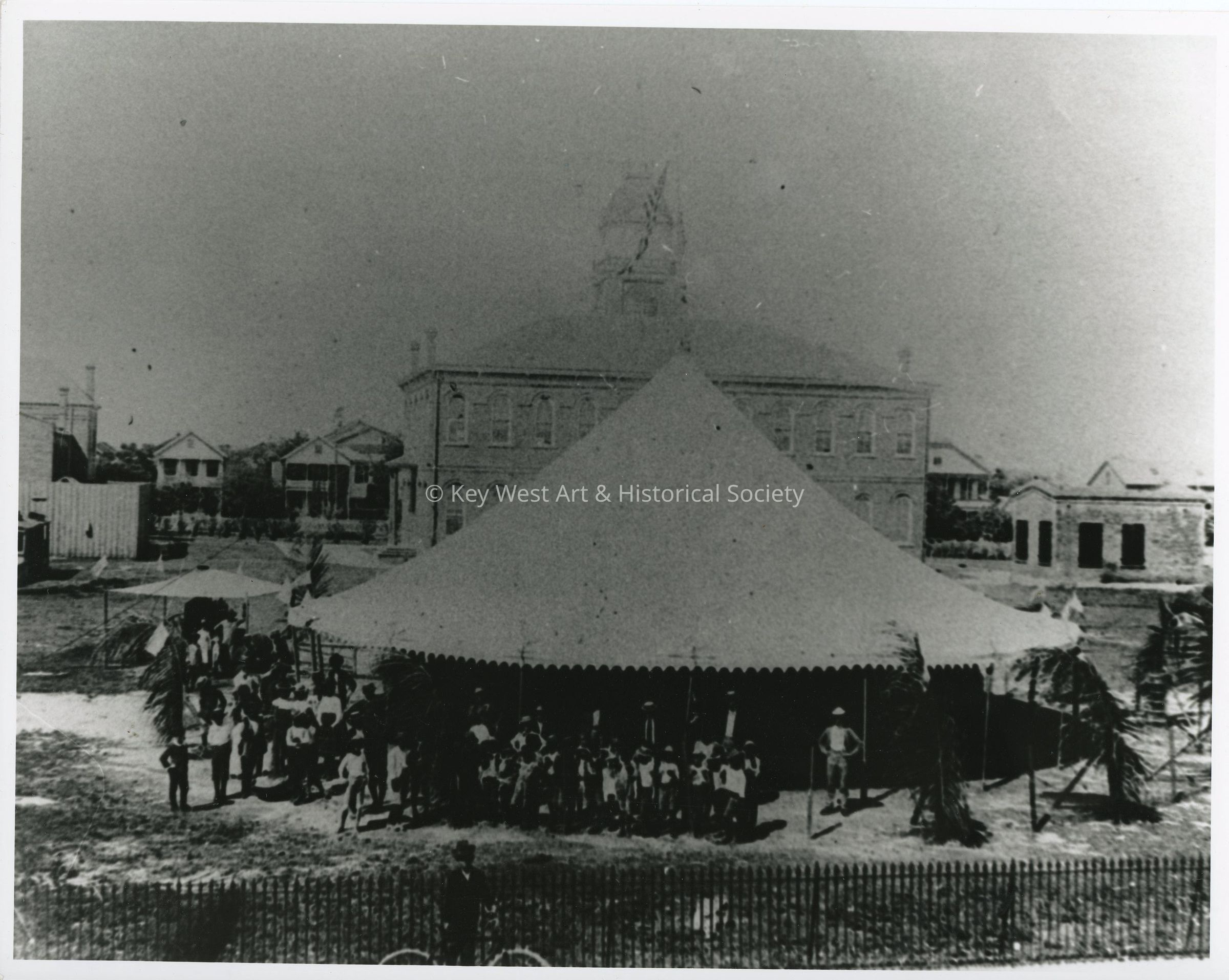 Black and white photograph of people gathering under a large tent belonging to a traveling circus on the grounds of Jackson Square behind the County Courthouse on Whitehead Street.