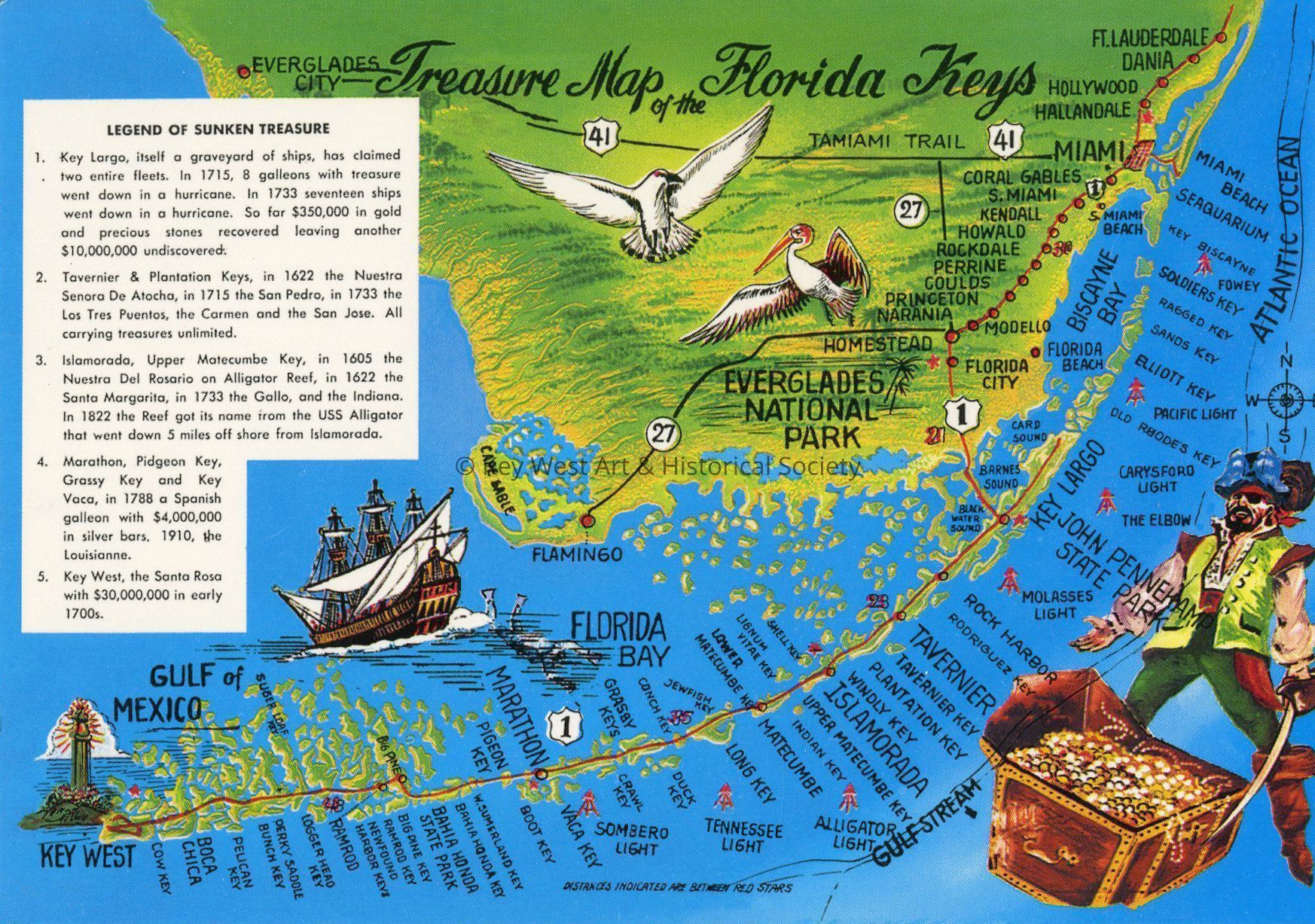 Color postcard depicting a hand drawn map of South Florida and the Florida Keys highlighting areas with shipwrecks. Notation on verso, 'The entire length of the Great Florida Reef, known as the Florida Keys, has for centuries been the graveyard of sunken vessels. The Spanish Empire lost an estimated $100,000,000 in treasures while being transported back in galleons. These ships were sometimes just the victims of the currents, but more often were victims of fierce hurricanes that dashed entire flotillas upon the jagged rocks and beaches of the Florida Keys. Notorious pirates such as Lafitte, Kidd, Morgan, Teach and Black Caesar made the Keys their operational headquarters. Even to this day, after a storm, gold and silver coins will wash up on one of the beaches in the Keys, to the delight of some tourist or native.'Collection