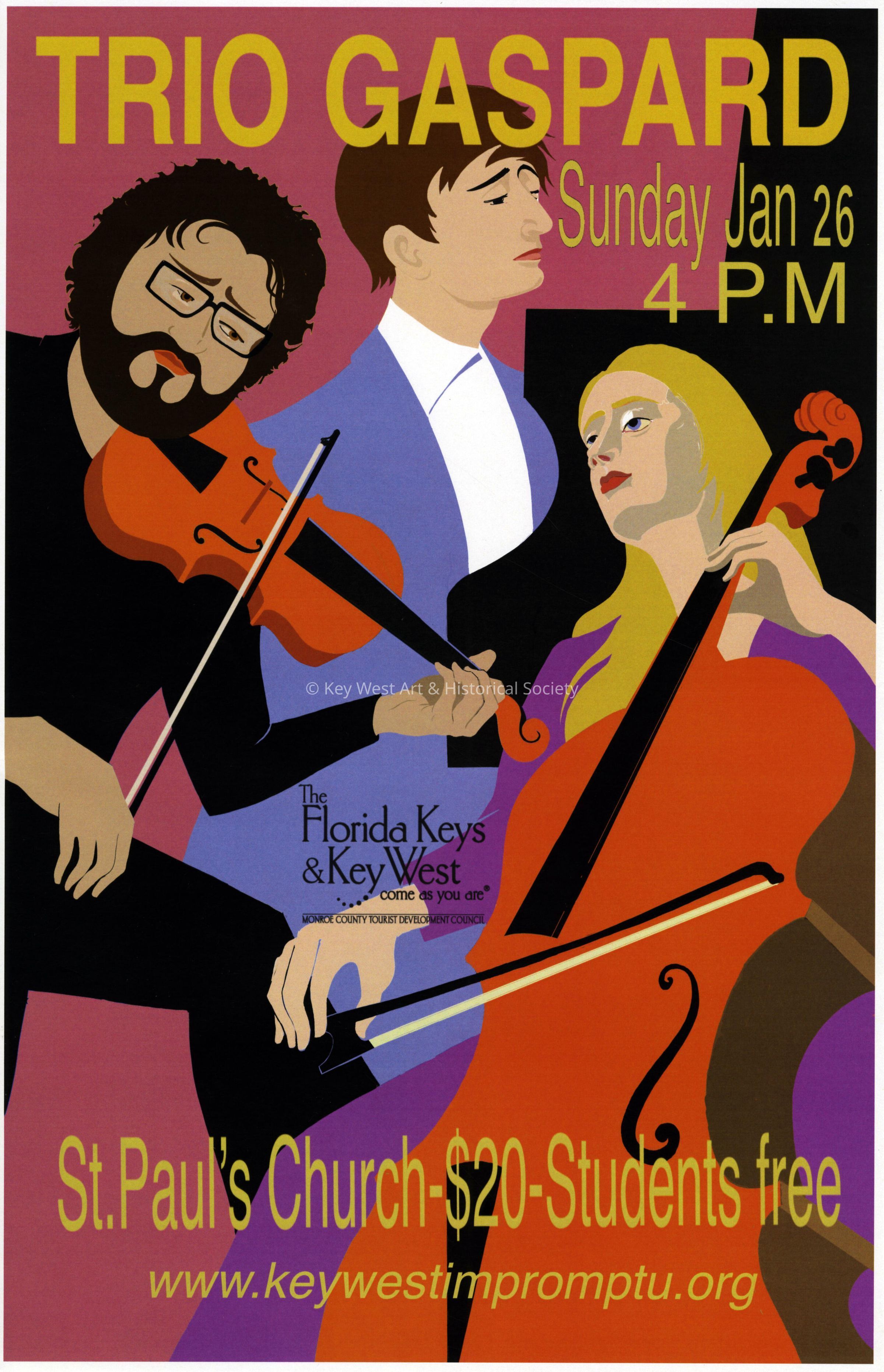 An advertising poster for Impromptu Classical Concerts entitled 'Trio Gaspard'. The concert took place on January 26, 2020 at St. Paul's Church, 401 Duval Street.Collection