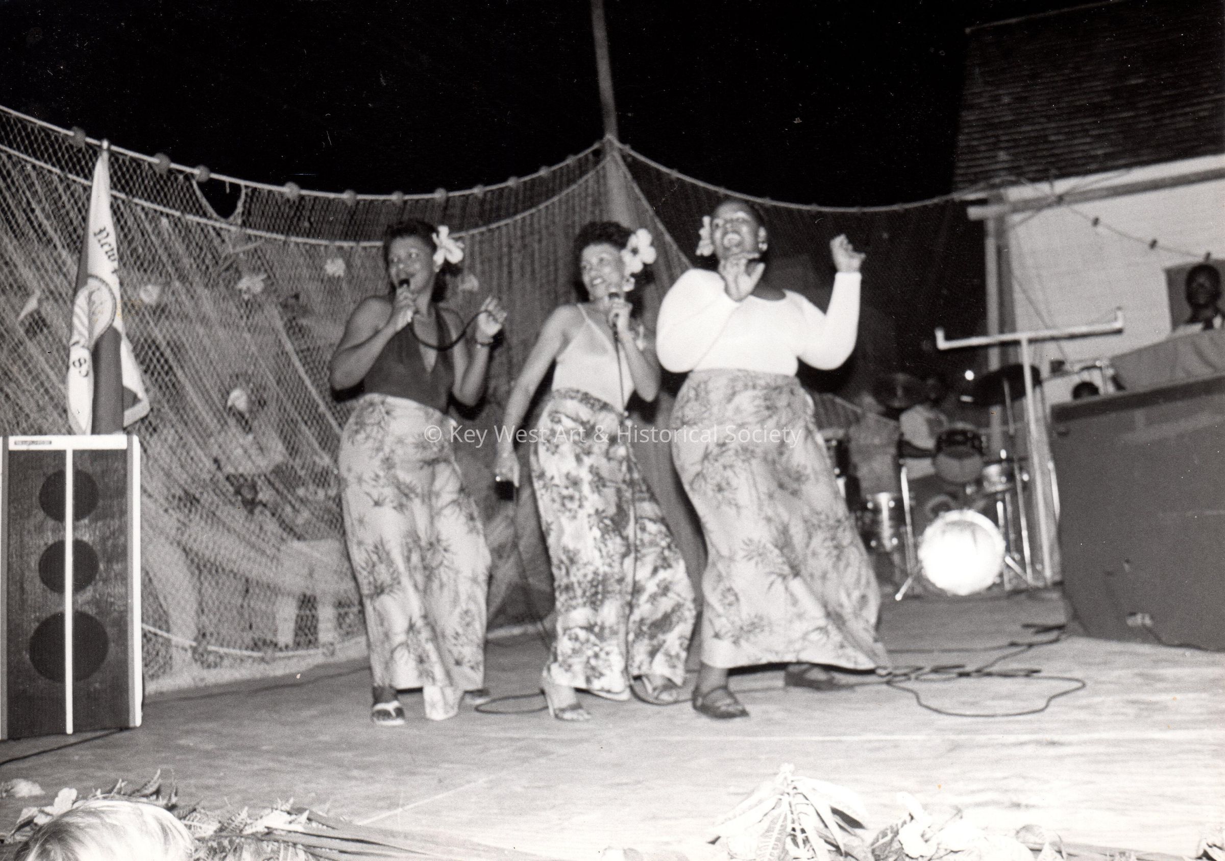 Black and white photograph of a trio of singers at an event in Green Turtle Cay.Photograph Details