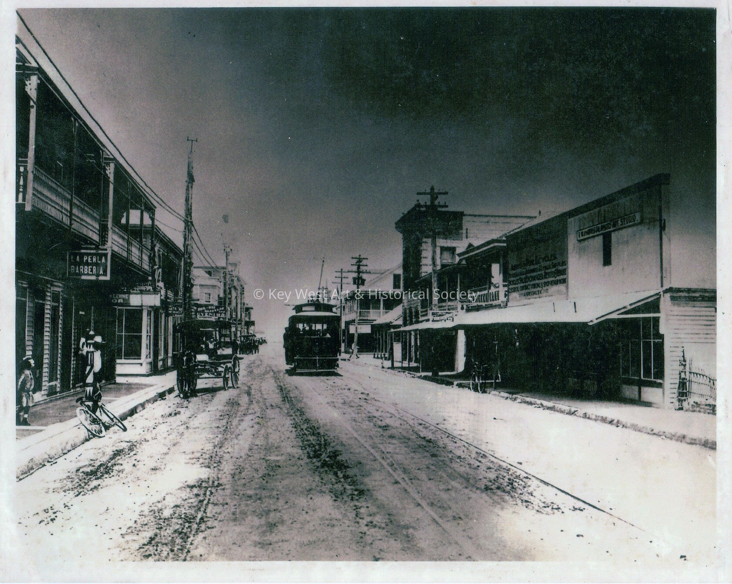 Black and white photograph of an electric streetcar car traveling on 200 block of Duval Street, passing the Island City Bank.