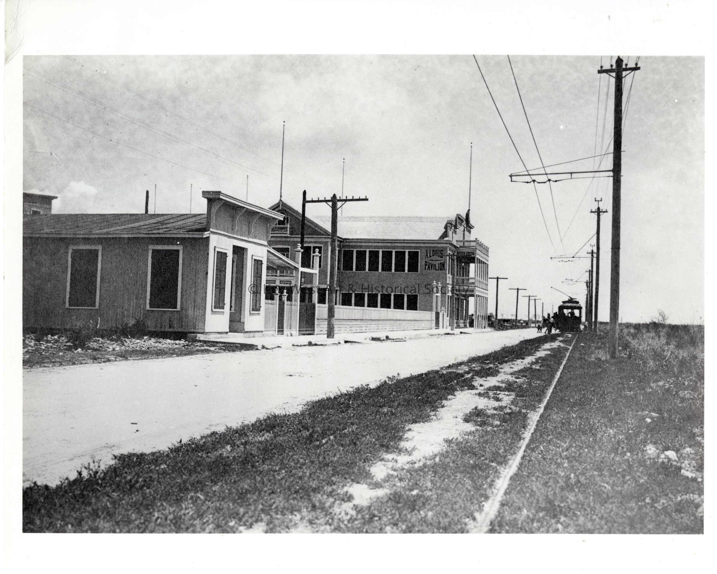 Black and white photograph of a streetcar and passengers outside the A. Louis Pavilion on Flagler Avenue near First Street.