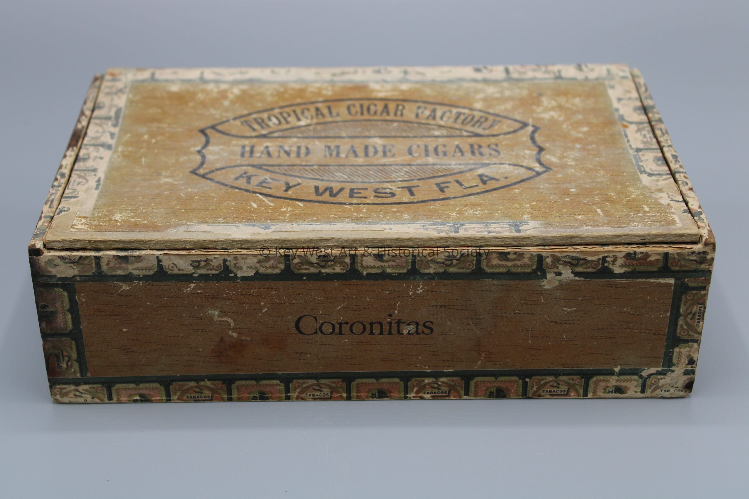 A wooden cigar box with a logo for the Tropical Cigar Factory of Key West on the lid. The box was meant to hold hand rolled Coronitas cigars. The edges of the box are lined with paper featuring illustrations of miniature crests. The interior of the lid has a label for the Tropical Cigar Factory with a palm tree and green text. The Factory was originally located at 918 Duval Street.