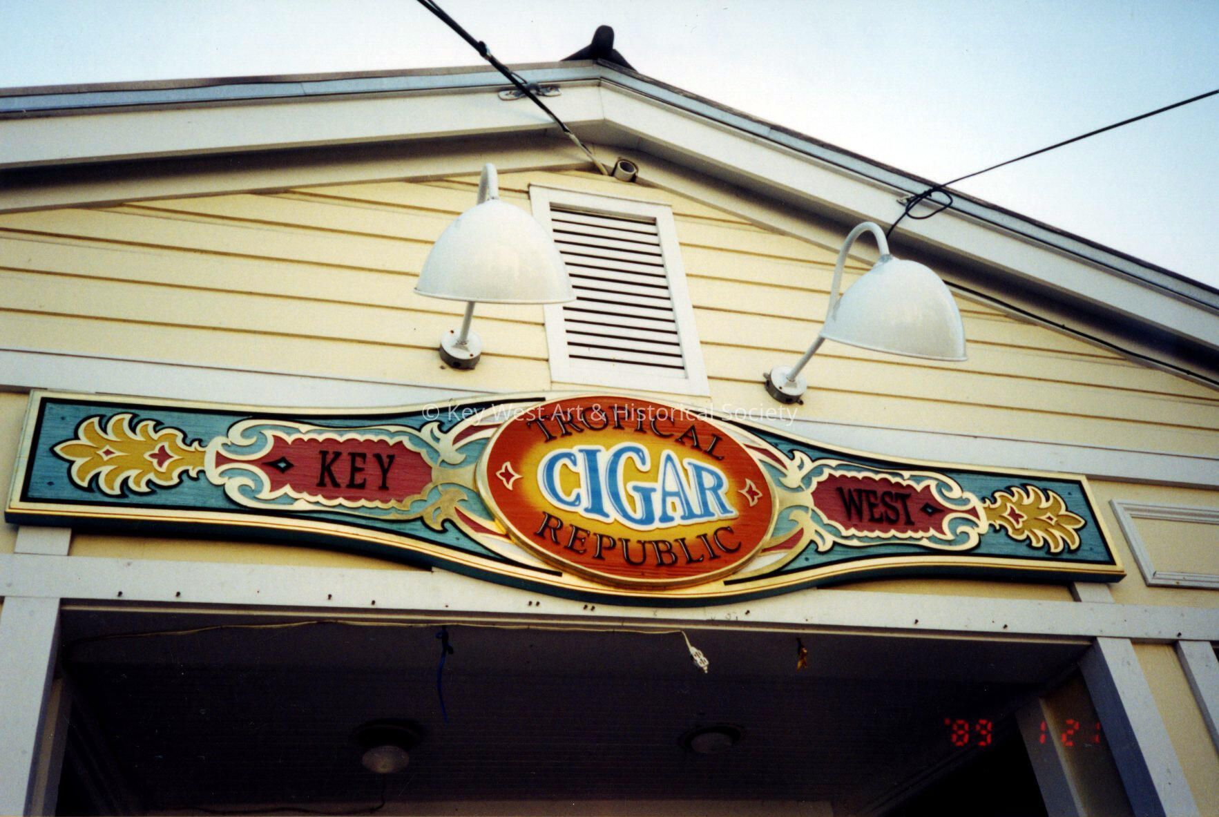 Color photograph taken by historian James M. Goode of the Tropical Cigar Republic sign at 112 Fitzpatrick Street during a trip to Key West in February 2001. Printed from Roll 8.