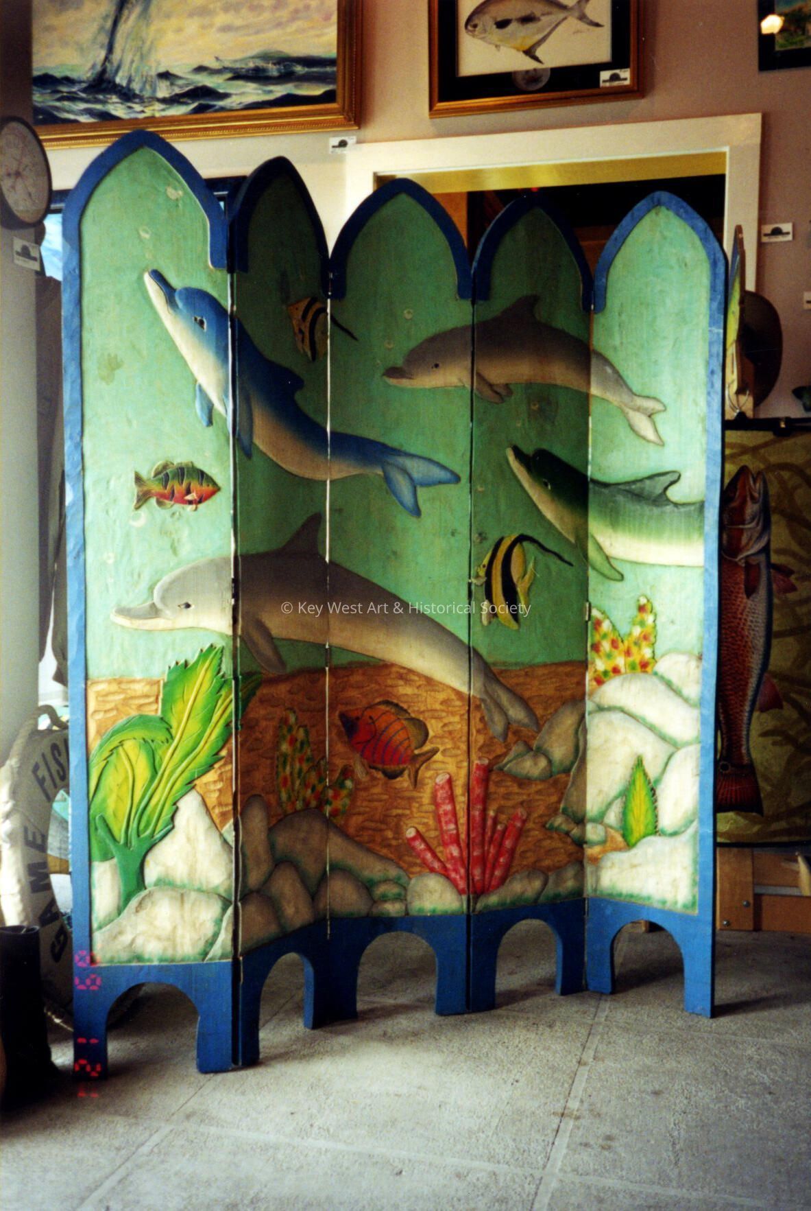 Color photograph taken by historian James M. Goode of a tropical five panel folding wood screen at Gamefish Gallery & Outfitters at 608 Greene Street during a trip to Key West in February 2001. Printed from Roll 8.
