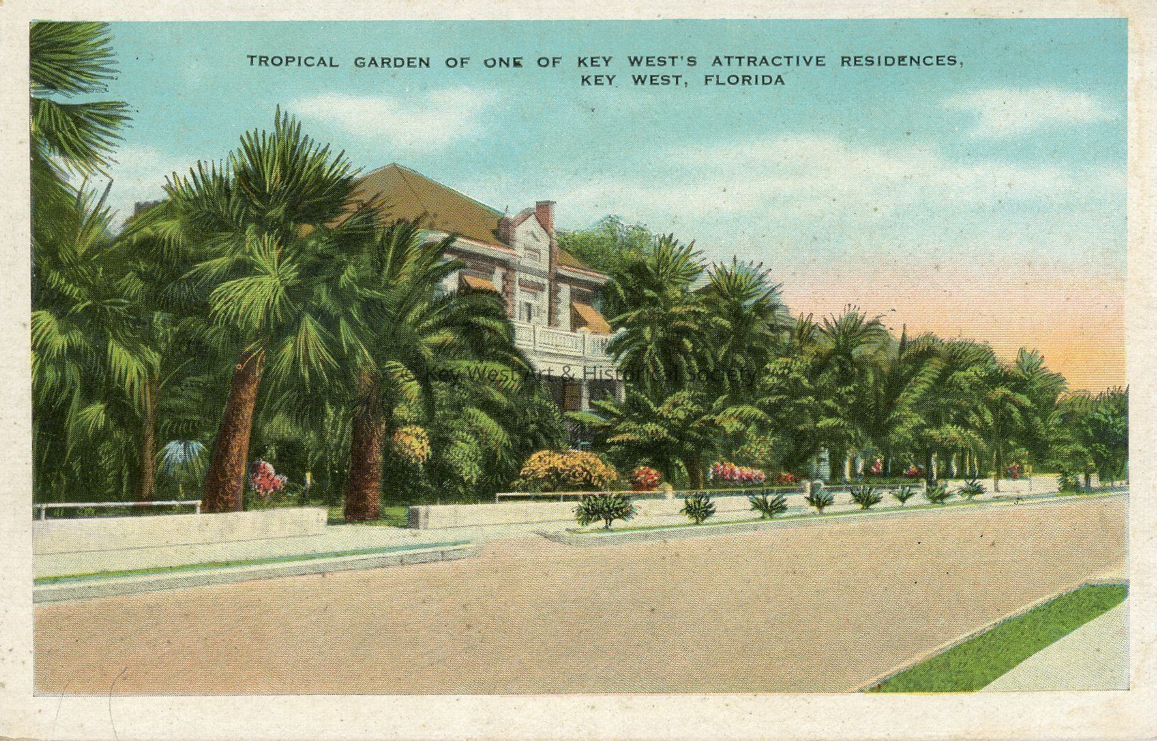 Postcard depicting the tropical garden of one of Key West's attractive residences, Key West, Florida. "On Division Street are many beautiful residences, the Convent of a Mary Immaculate, Catholic Church, the Division Street Grammar School, and the Key West Municipal City Park."Collection