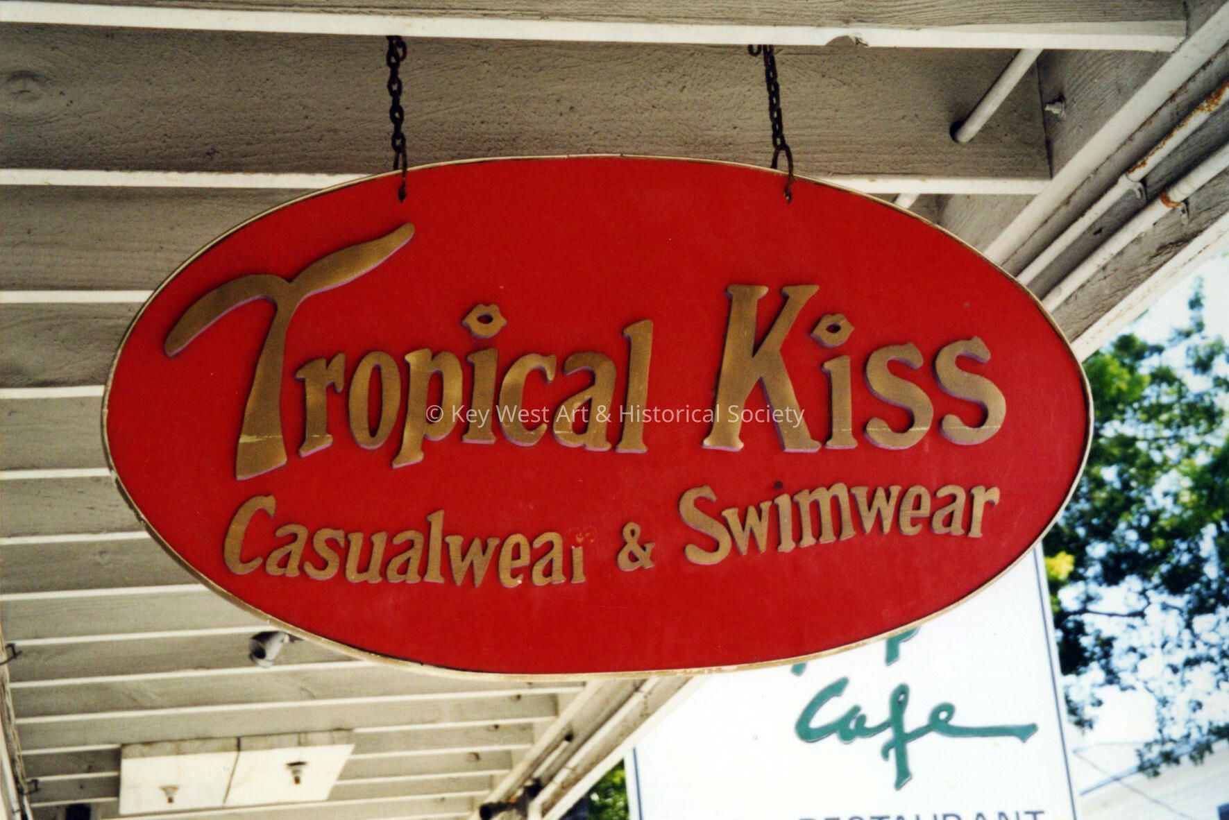 Color photograph taken by historian James M. Goode of the Tropical Kiss Casualwear & Swimwear sign on Front Street during a trip to Key West in August 2001. Printed from Roll 17.