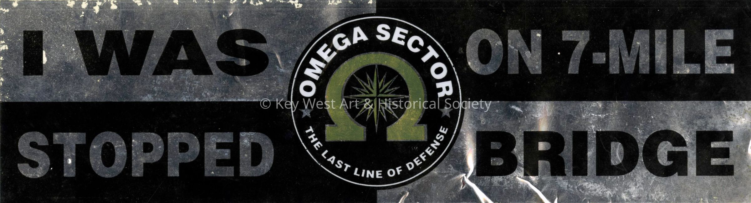 Metallic bumper sticker given to motorists during the closure of the Seven Mile Bridge when the movie True Lies was being filmed. Reads, 'I was stopped on 7-Mile Bridge, Omega Sector, The Last Line of Defense'. The latter is in reference to a counter-terrorism task force that employs Arnold Schwarzenegger's character. Lengthy text on verso.Collection