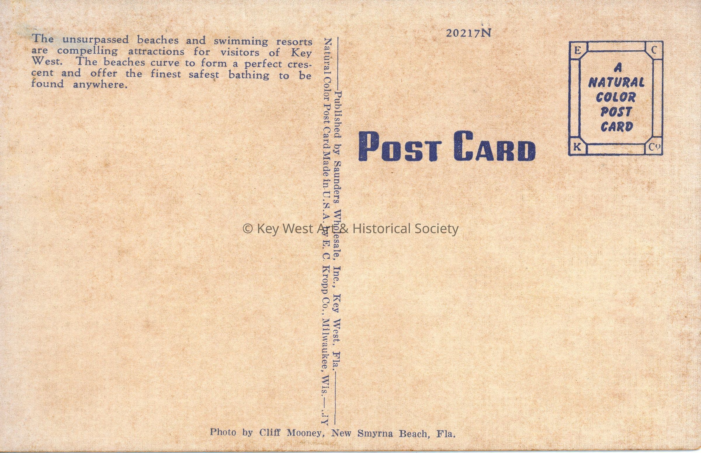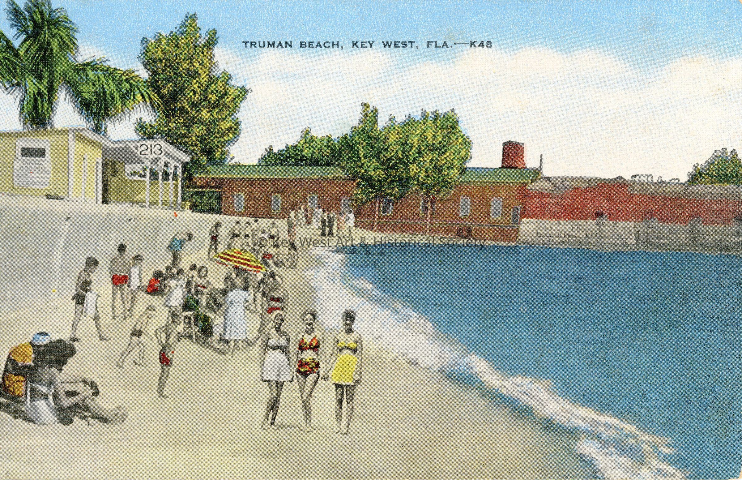 Postcard depicting on Truman Beach adjacent to Fort Zachary Taylor. Notation on verso reads 'The unsurpassed beaches and swimming resorts are compelling attractions for visitors of Key West. The beaches curve to form a perfect crescent and offer the finest safest bathing to be found anywhere.'Subject Place
