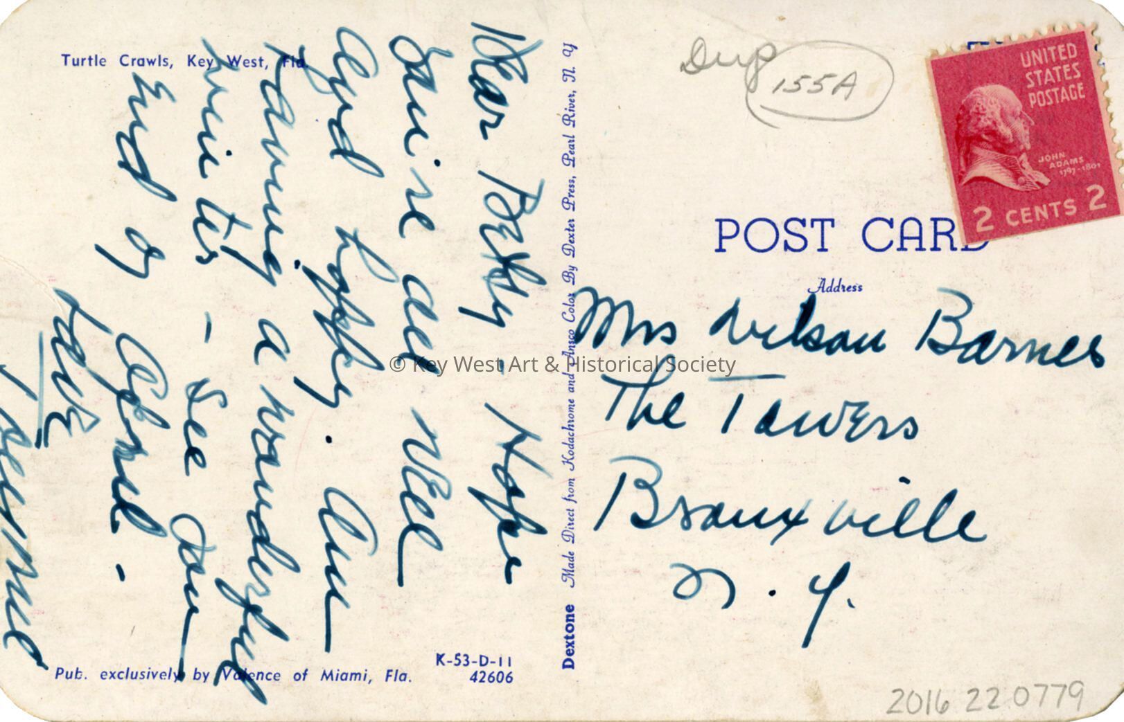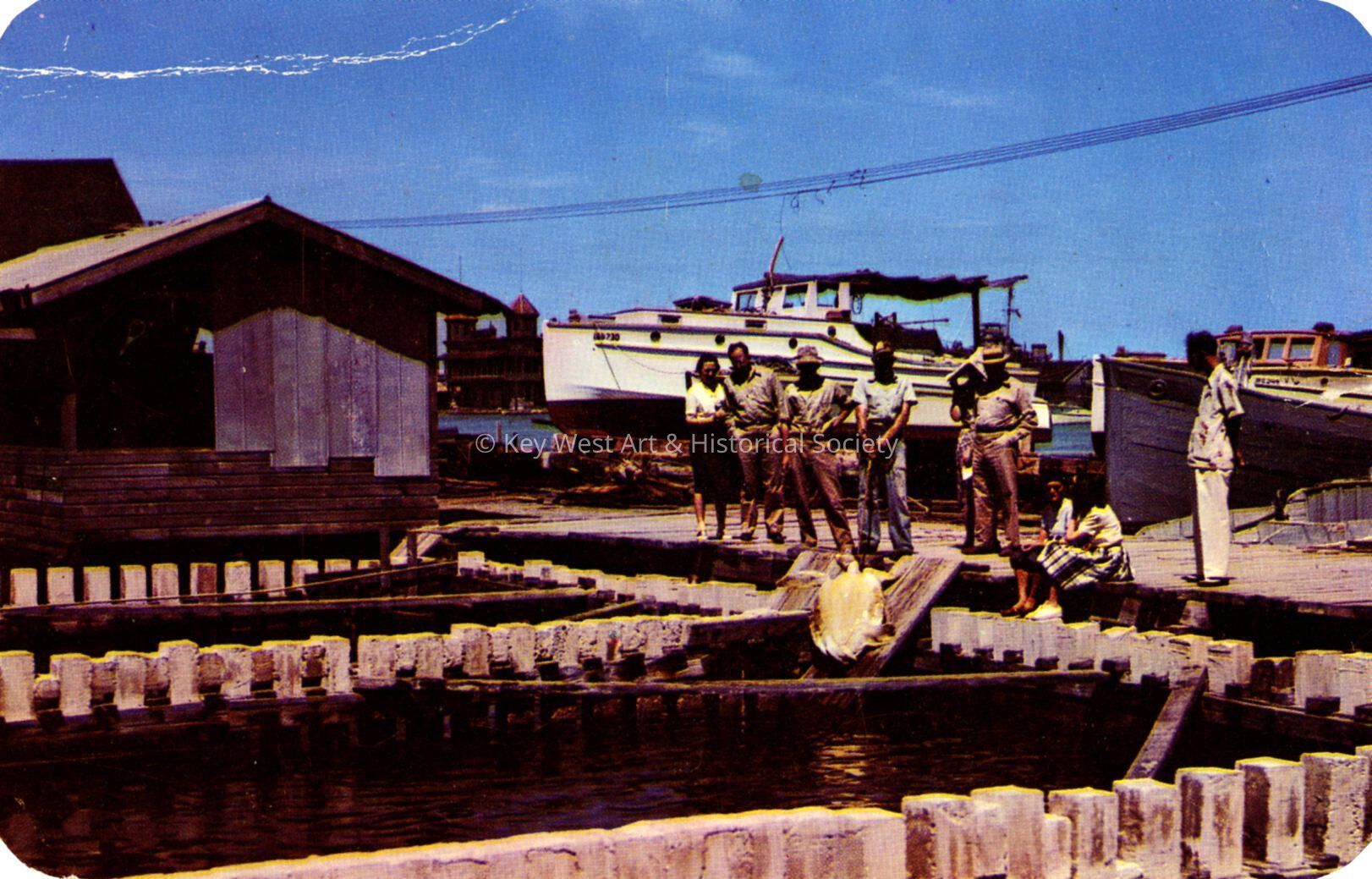 Postcard depicting visitors watching the unloading of the turtle kraals in Key West Bight.Subject Place