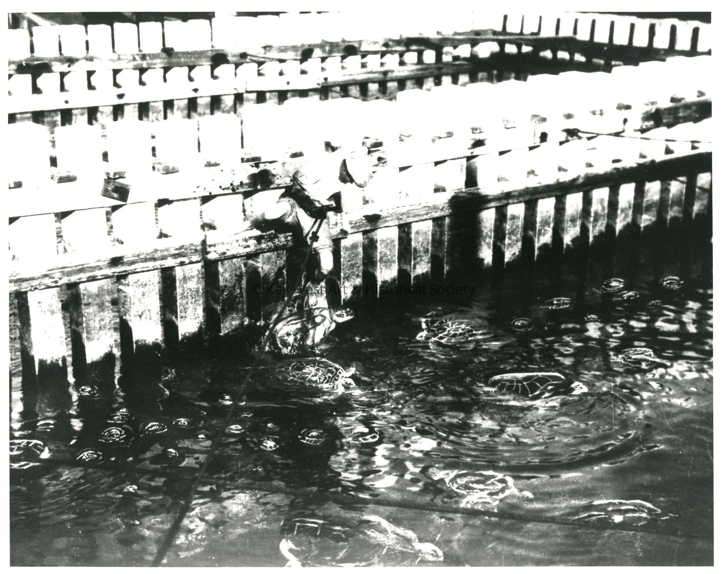 Black and white photograph of sea turtles contained in the turtle kraals in the Key West Bight.