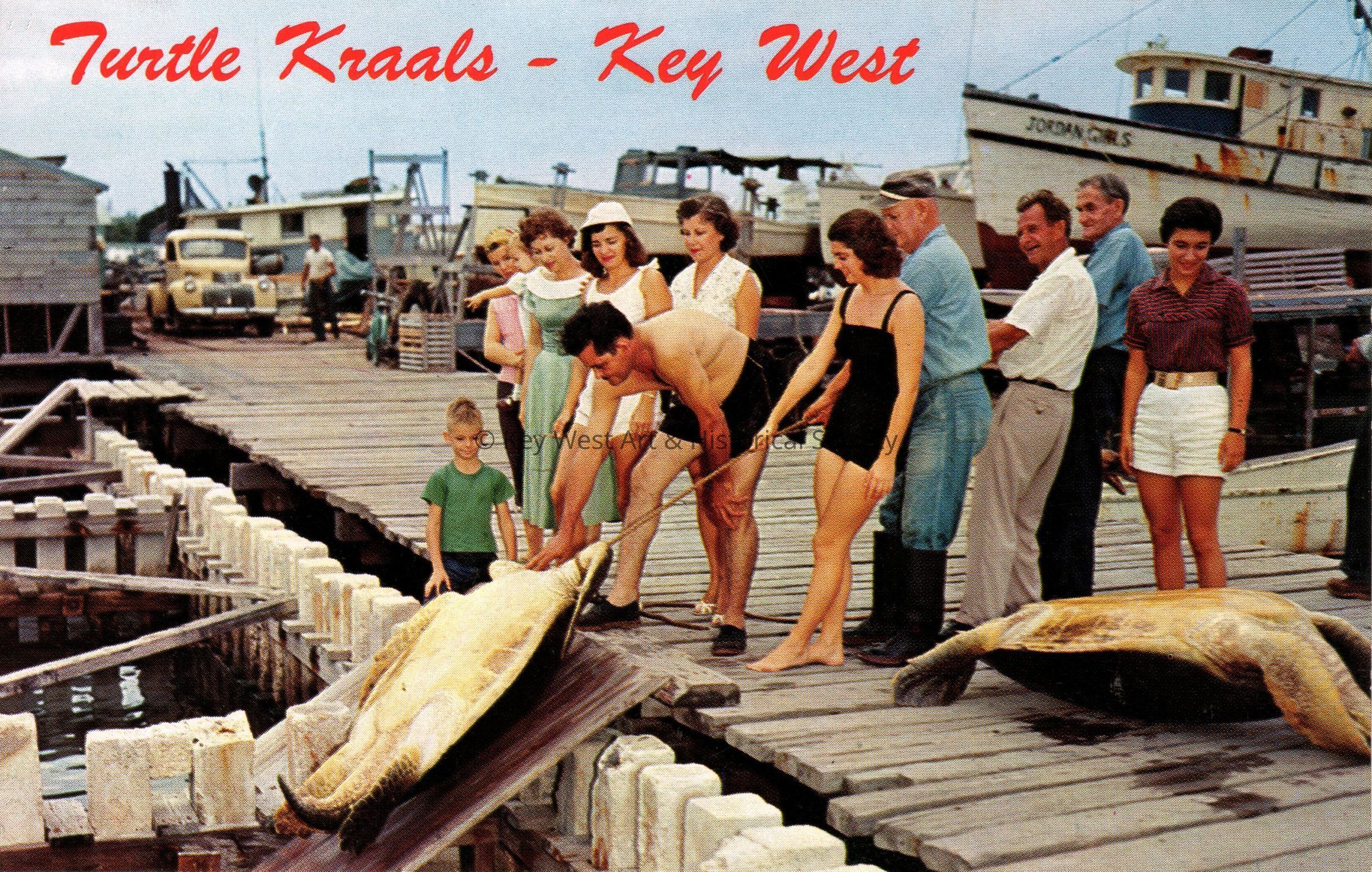 Postcard depicting people on a pier using a rope to move a large turtle out of a pen. The caption reads, ‘Turtle Kraals, Key West’. The description on the verso reads, 'Turtle Crawls, Key West, Florida. Visitors to this beautiful island city may view these Giant turtles weighing from 150 to 350 pounds each. The crawls are built of concrete posts, properly spaced to prevent the turtles from escaping and to allow fresh sea water to circulate through them. Green Turtle Steak is a delicacy served in most Florida Keys Restaurants. Green Turtle Soup is also made form the gelatinous meat found in the back and breast of the turtle.'Subject Place