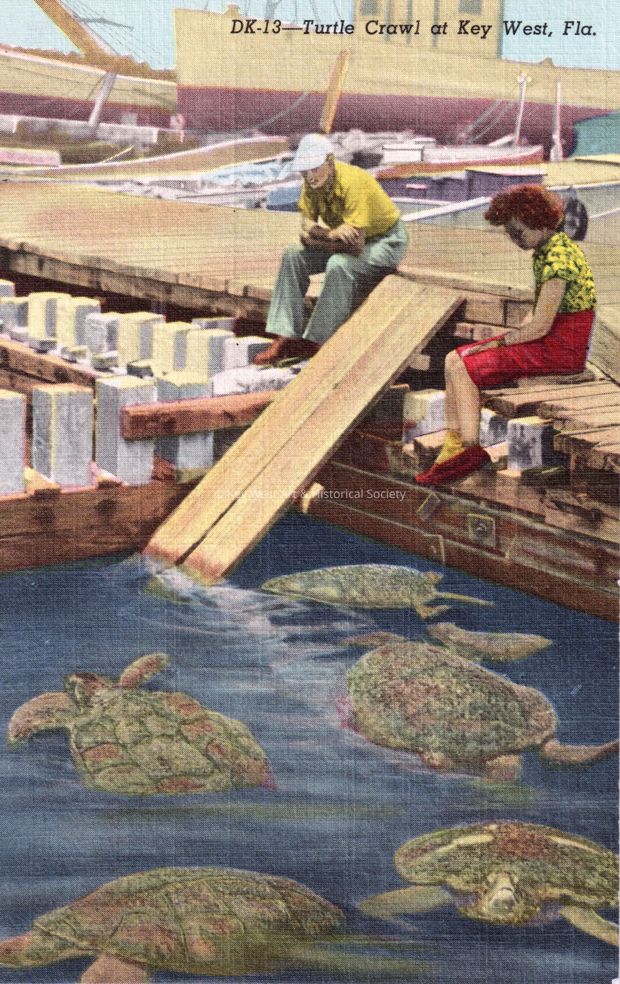 Postcard depicting a man and woman watching turtles swimming in a pen. The caption reads, ‘Turtle Crawl at Key West, Florida’. The description on the verso reads, 'Turtle Crawls. Where turtles weighing hundreds of pounds are stored in pens, waiting to be slaughtered for market. Key West has long been famous for green turtle steaks and soups.'Subject Place
