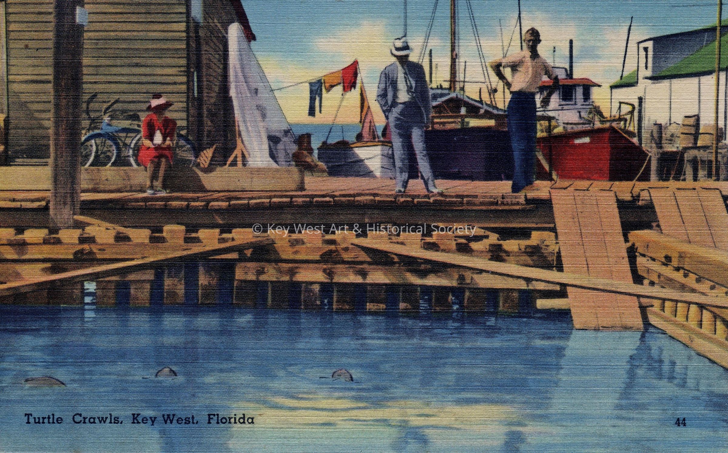 Postcard depicting men and a woman watching turtles swimming in pens. The caption reads, ‘Turtle Crawls, Key West, Florida’. The description on the verso reads, 'The only cannery of green turtle soup in the United States is in Key West, and its products are exported all over the world wherever epicures congregate. The turtles, weighing 300 to 400 pounds are caught in South American waters and penned in "crawls" and they gaze with stoic calm at the strange people who come to look at them.'Collection