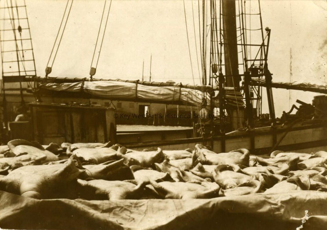 Black and white photograph of turtles on the dock in Key West Bight. Caption on verso reads, 'Key West - Turtles on the wharf 50 to 500 lbs.'