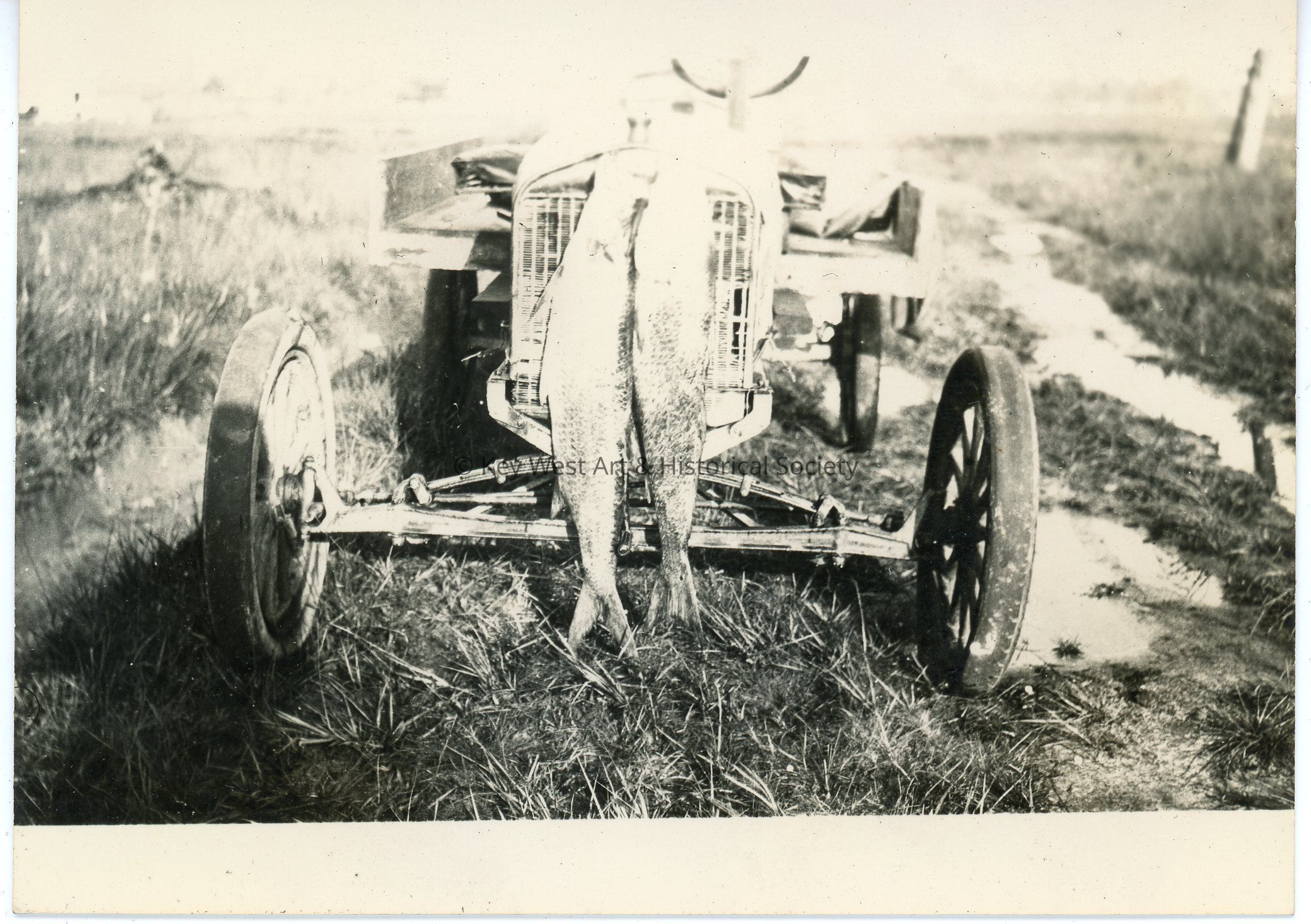 Black and white photograph of two (2) fish hanging from a car or tractor grill. The photo was part of a photograph album began by Victor H. Baker in 1940.